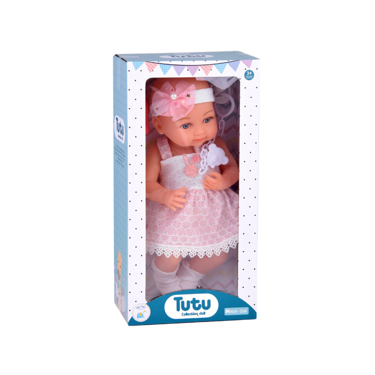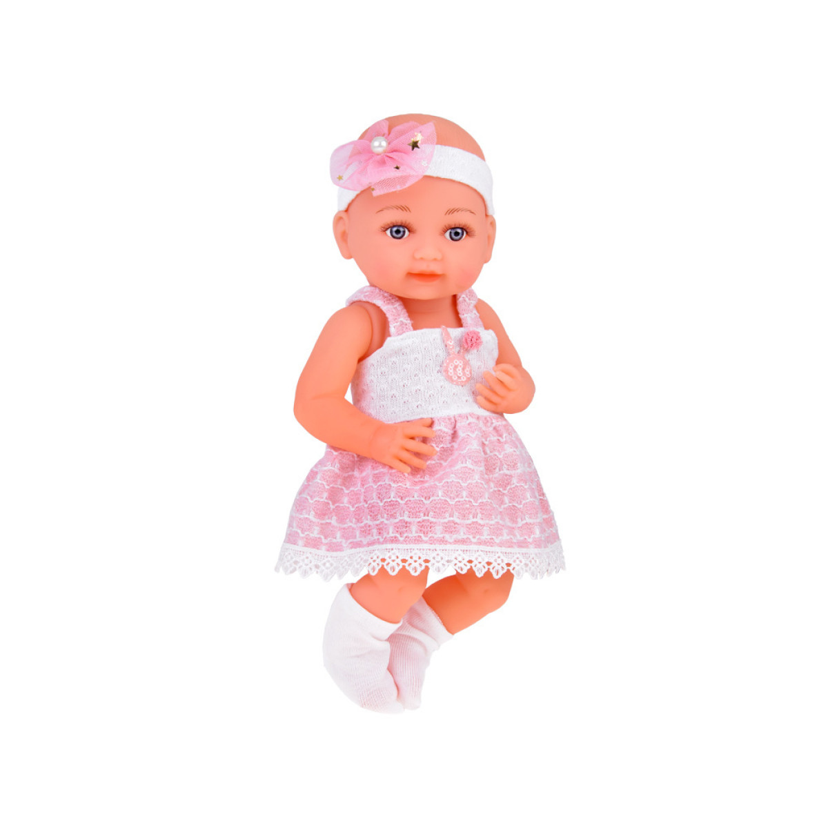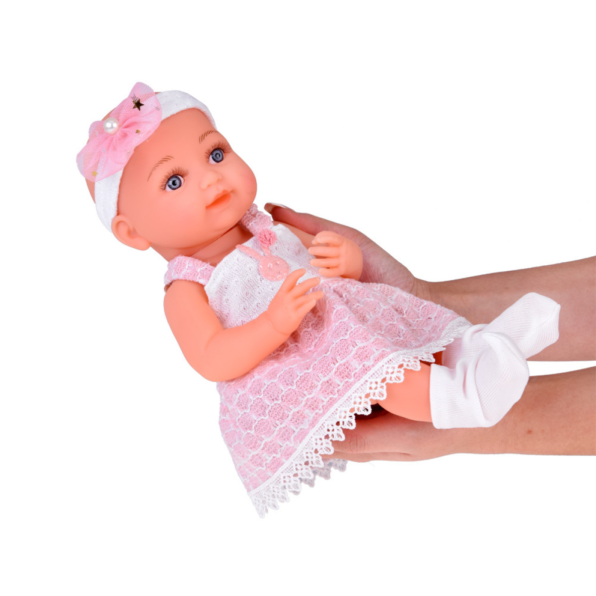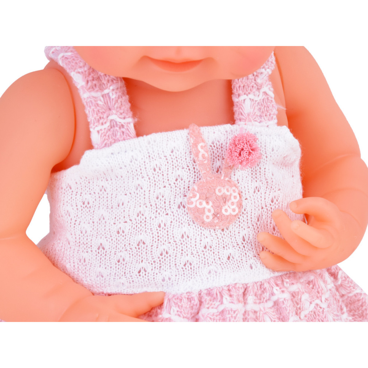 Lelle ir izgatavota no cietas gumijas ar rūpību par detaļām. Uzmanību piesaista lielas, zilas acis, kas apvītas ar garām skropstām. Lelles acis neaizveras. Simpātiskā sejas izteiksme aicina uz rotaļām. Bēbis ir ģērbts skaistā balti-rozā kleitā, kas ir dekorēta ar truša un pom-poma elementiem, kā arī mežģīnēm. Lelles galva ir rotāta ar tiulveida lentīti un pērlīti, un tā nēsā baltas zeķītes.