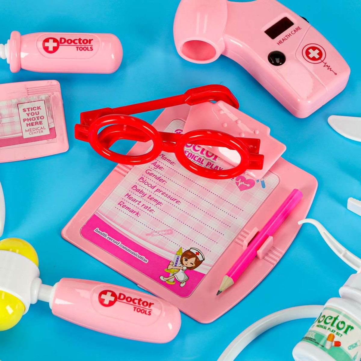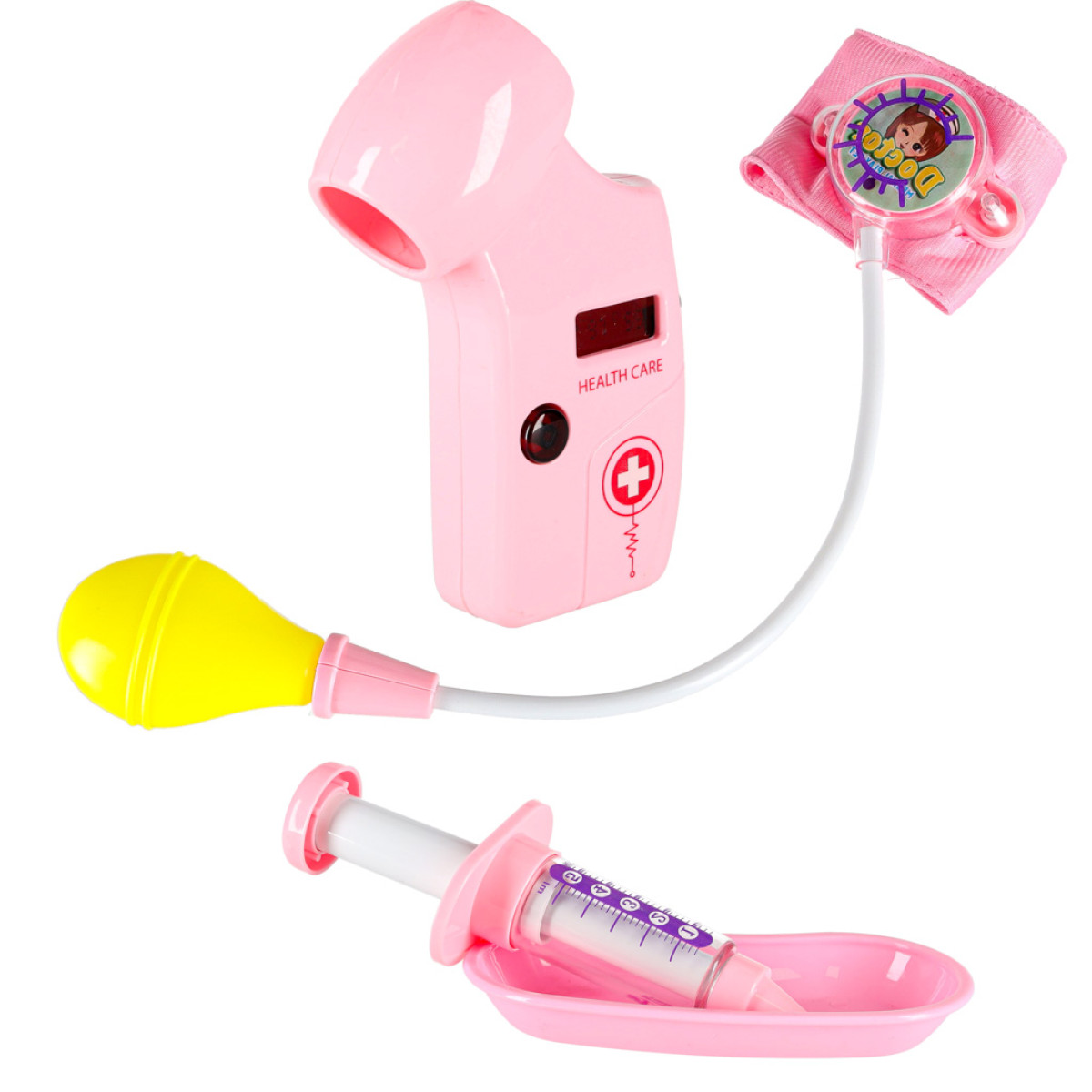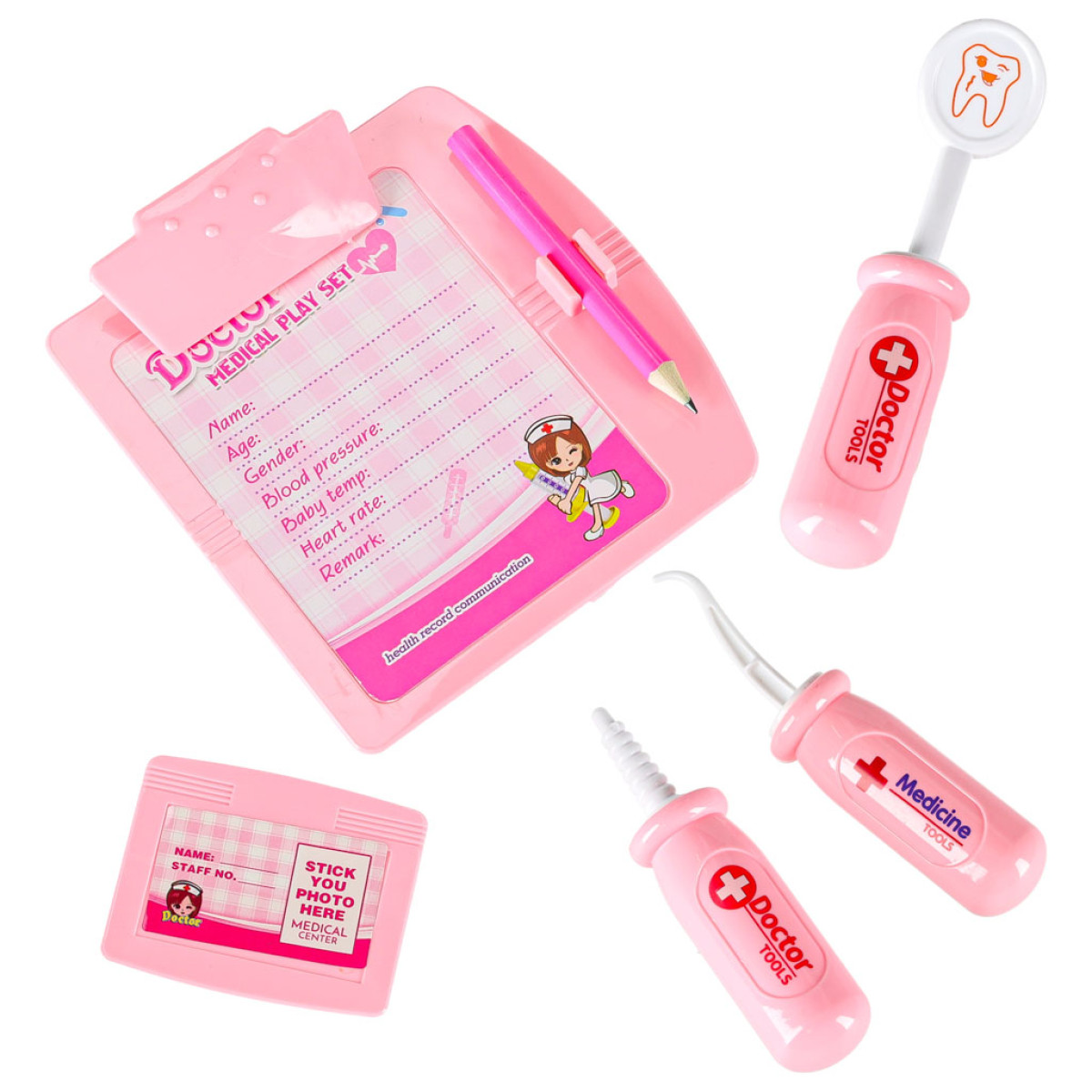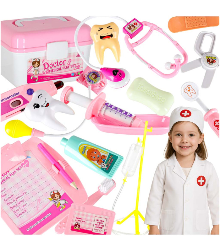 Jauks mazā ārsta komplekts ar baltu un rozā koferi sniedz bērnam daudz iespēju radošai spēlei. Pieejami piederumi ģimenes ārstam, zobārstam un medmāsai. Spēles laikā bērns var atveidot ainas no ārsta kabineta vai slimnīcas, dodot pacientiem rotaļu medikamentus, uzliekot pārsējus, veicot injekcijas vai pievienojot pie pilinātāja. Ar bateriju darbināmām rotaļlietām bērns var klausīties sirdsdarbību ar stetoskopu, apskatīt ausi ar otoskopu vai izmērīt pulsu ar pulsometrs. Klipša un zīmuļa pamatne ļauj ievietot piezīmju blociņu, kur bērns varēs rakstīt pacientu datus.