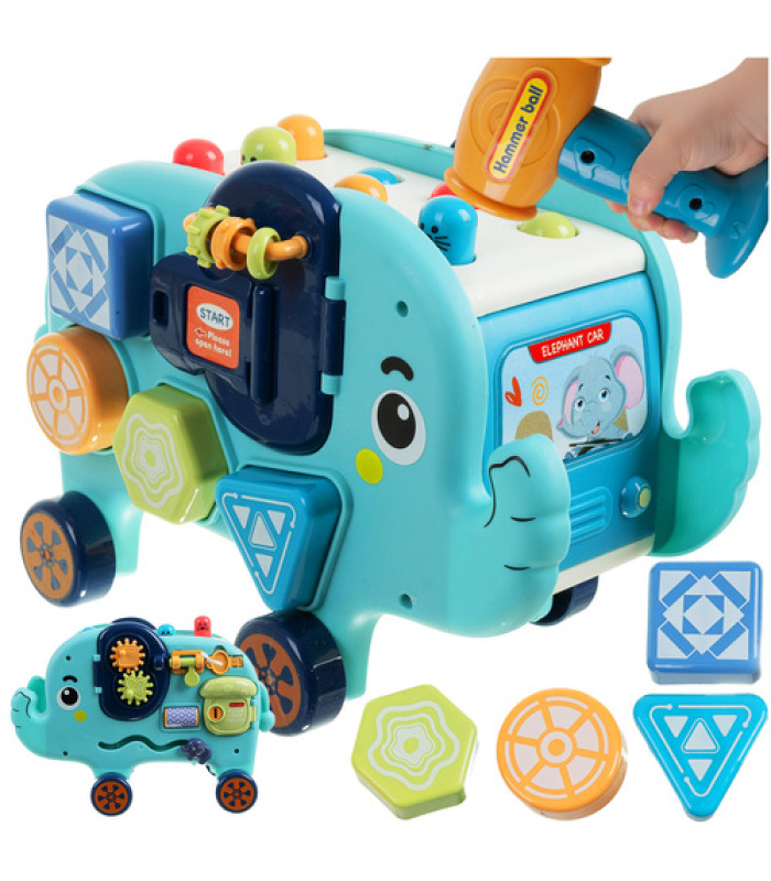 Edukacinis dramblys – Montessori dėlionė, manipuliavimo lenta, kaladėlės, KRUZZEL plaktukas