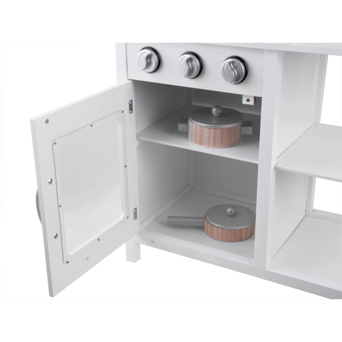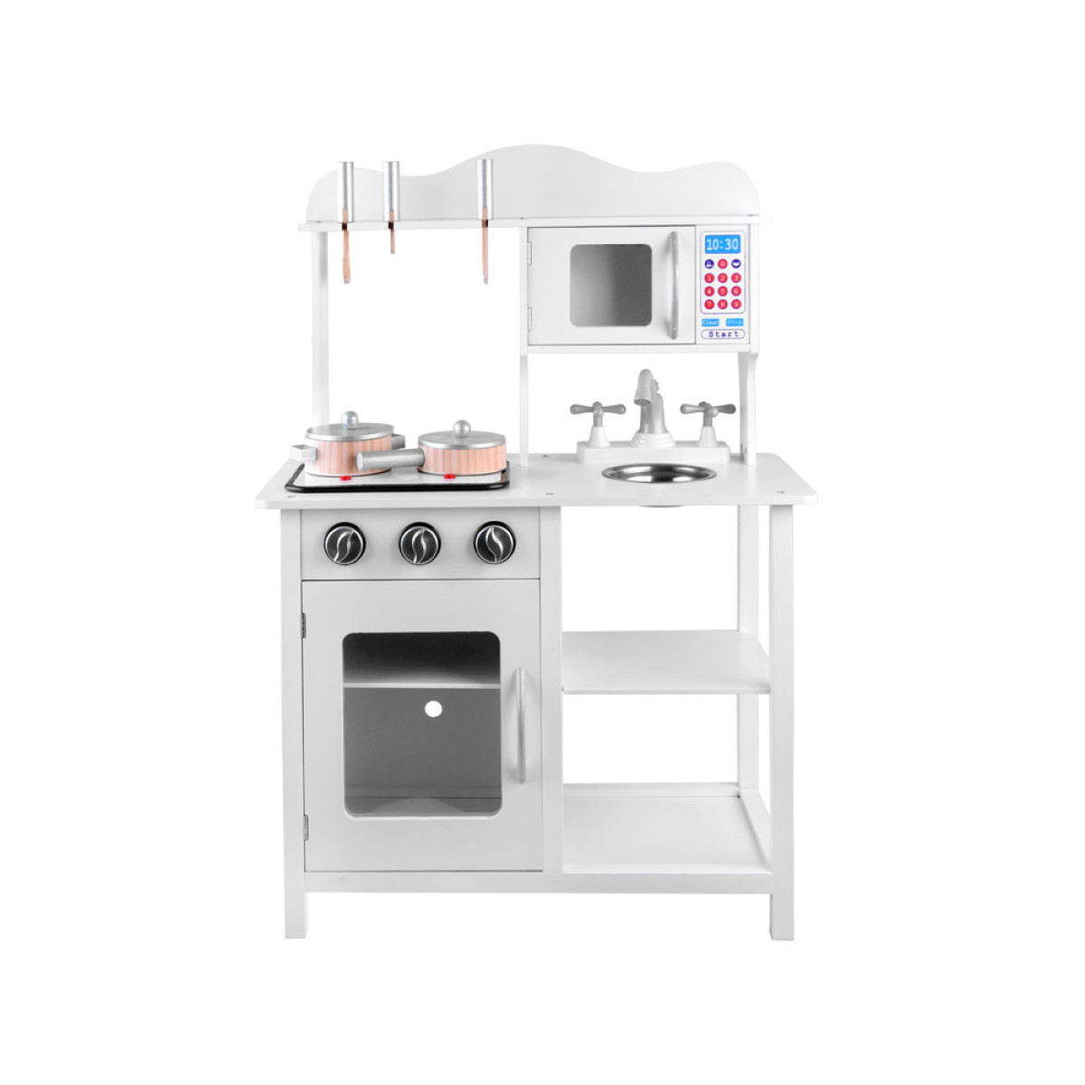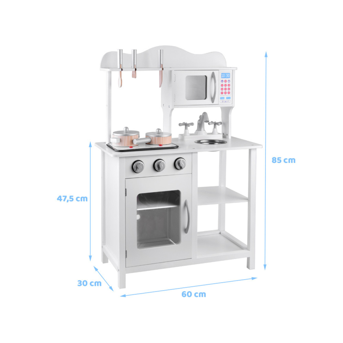 Šī elegantā, baltā virtuve ar aksesuāriem ir ideāla dāvana jebkuram mazajam pavāram. Aprīkota ar reālistiskām funkcijām un izgatavota no drošiem materiāliem, tā nodrošina ilgstošas stundas prieka un radošas rotaļas.