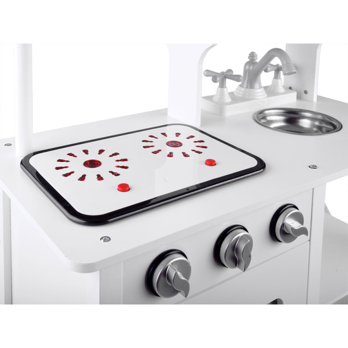 Plīts ar gaismas un skaņas efektiem imitē īstu gatavošanu – dzirdama burbuļošana un verdoša ūdens skaņa. Nepieciešamas 2 AAA 1,5V baterijas (nav iekļautas komplektā).