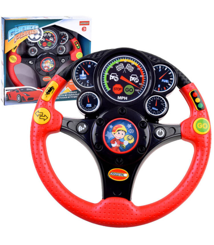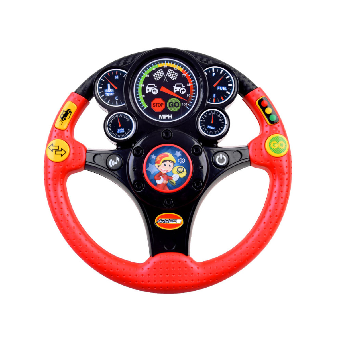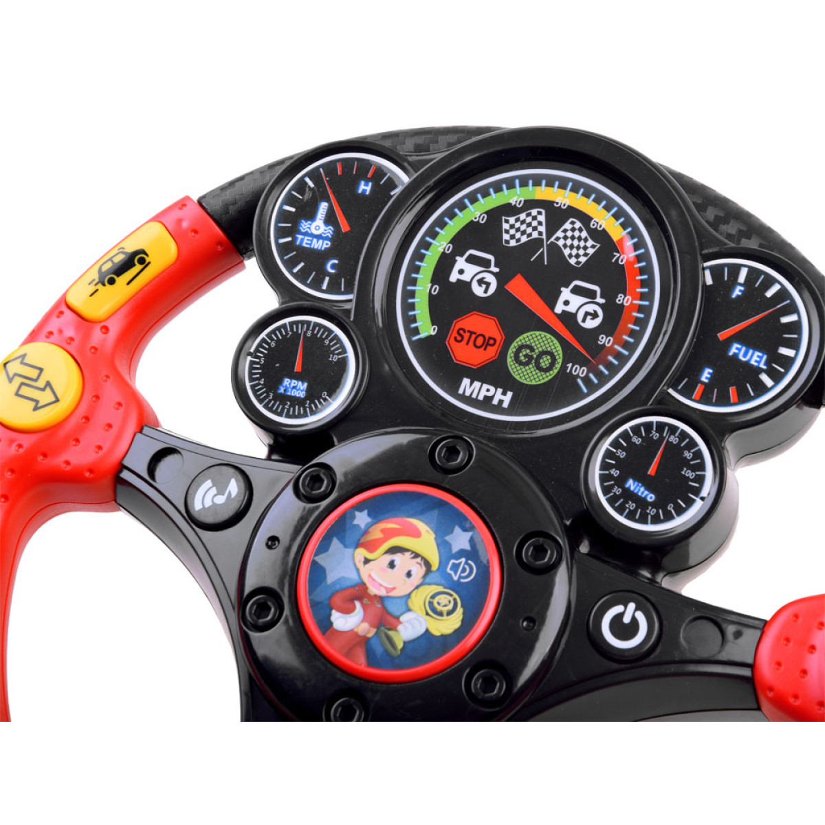 23,5 x 23,5 x 5 cm. Rotaļlieta ir pilnībā izgatavota no plastmasas melnā un sarkanā krāsā ar apgaismotu pulksteni, nodrošinot daudz radoši pavadītu laiku. Ar interaktīvo stūres ratu ceļojums uz bērnudārzu vai ekskursijā būs tikai tīra bauda. Rotaļlieta ir iepakota kartona kastē, lieliski piemērota kā dāvana jaunajam autovadītājam.