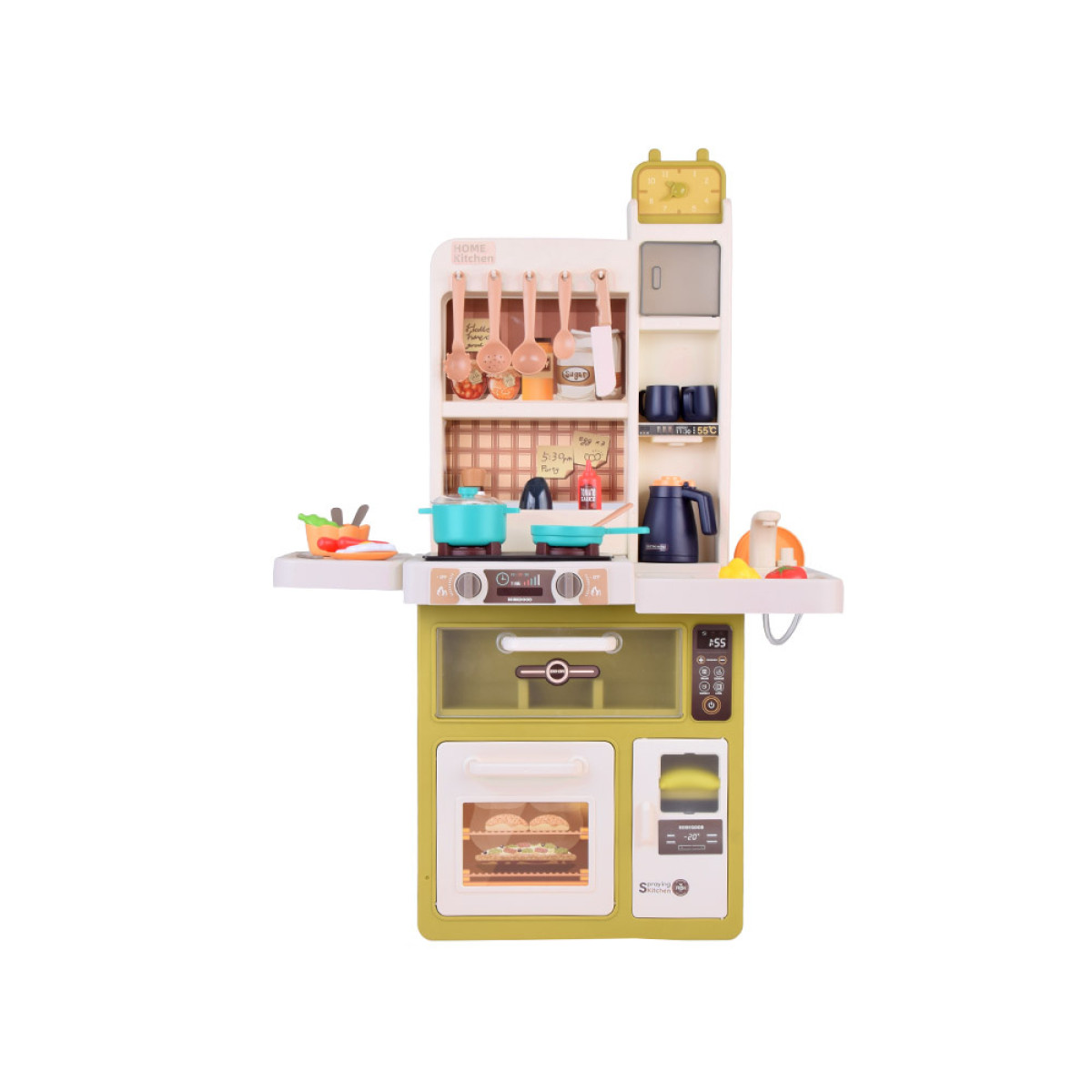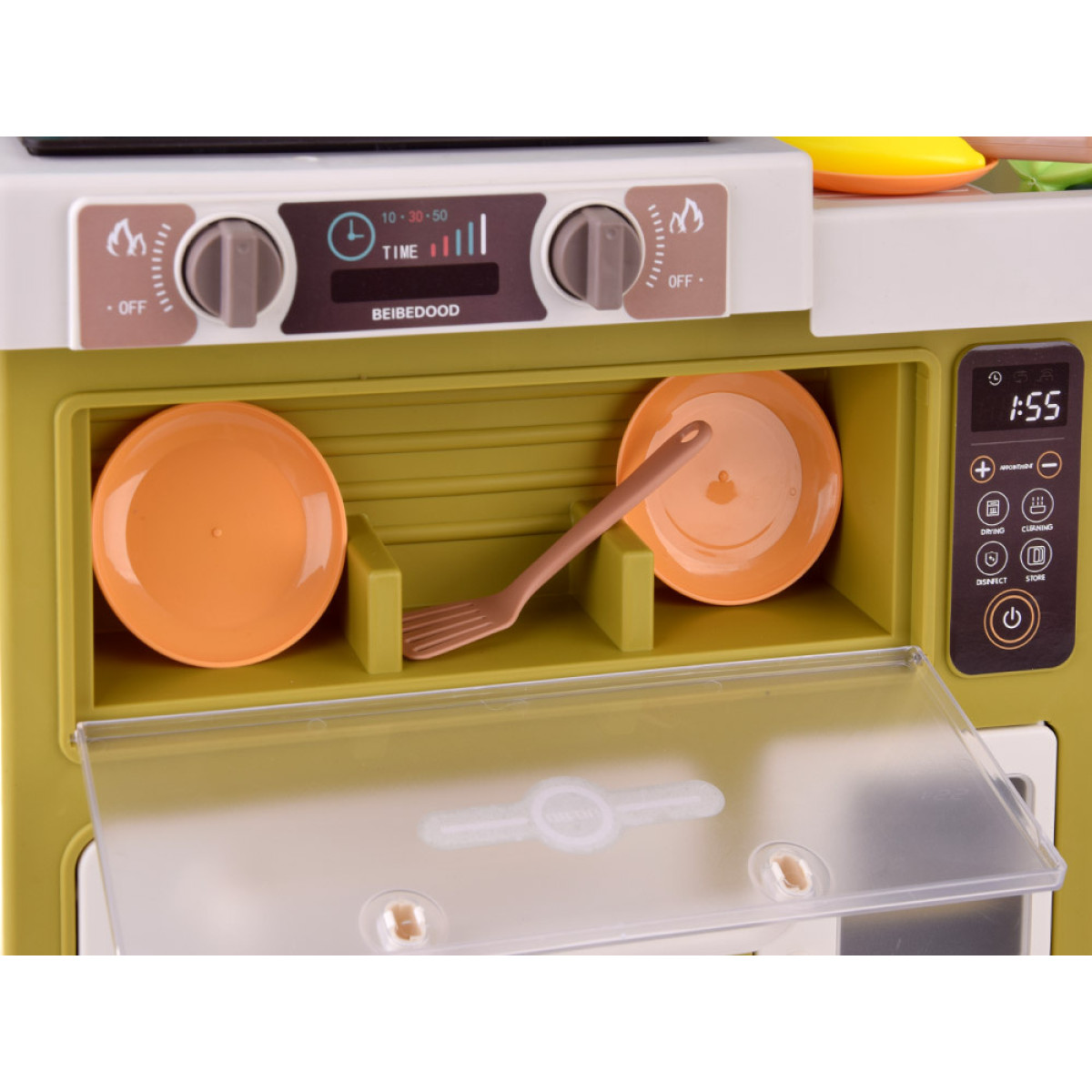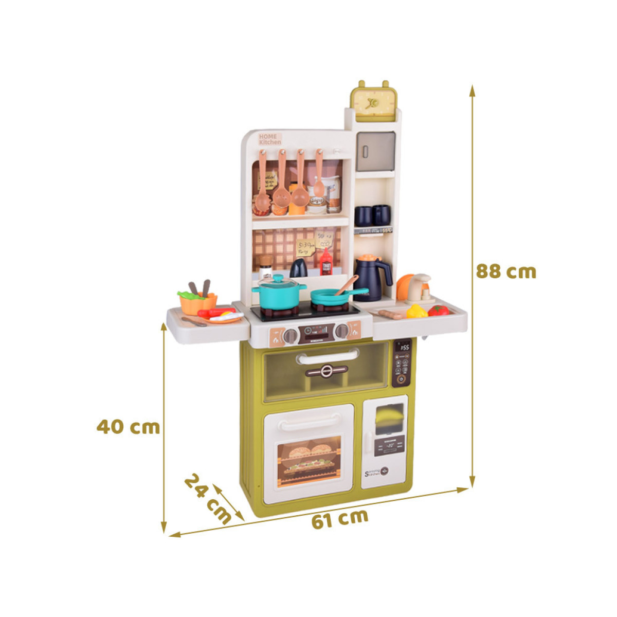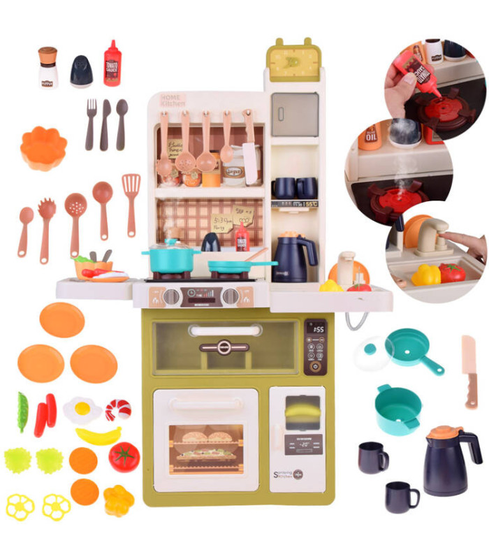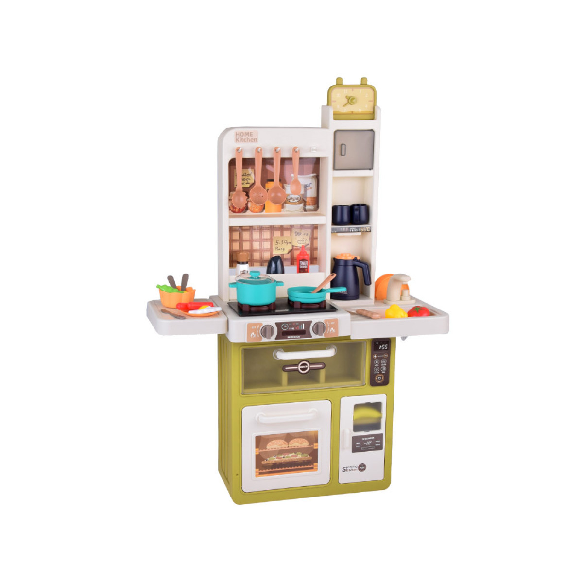 Interaktīvā bērnu virtuve ar piederumiem ir krēmzaļā krāsā, un tā sastāv no 55 elementiem. Šis komplekts atdarina īstu virtuvi, ļaujot bērniem spēlēt lomas un atdarināt pieaugušos gatavojot. Virtuvē ir cepeškrāsns, ledusskapis, trauku mazgājamā mašīna, plaukti, āķi, tvaika nosūcējs, pulkstenis ar kustīgām rādītājām, kā arī izlietne ar krānu, no kura tek ūdens. Virtuve darbojas ar baterijām, kas ļauj izmantot skaņas un gaismas efektus, piemēram, burbuļošanu, spīdošus degļus un tvaiku.