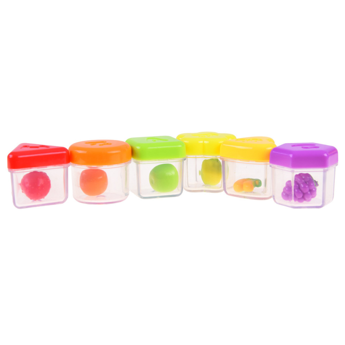 - 6 krāsainus klucīšus ar augļiem, burtiem un cipariem