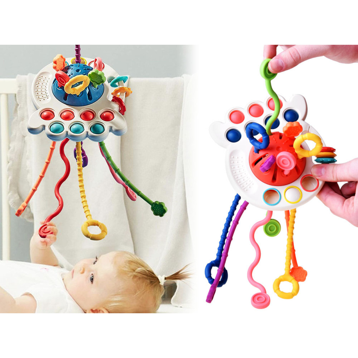 - rotaļlietu var piestiprināt pie sēdeklīša, ratiņiem vai pat gondolas.