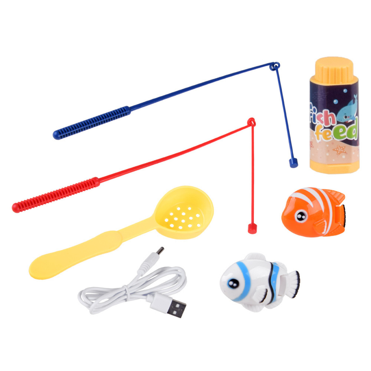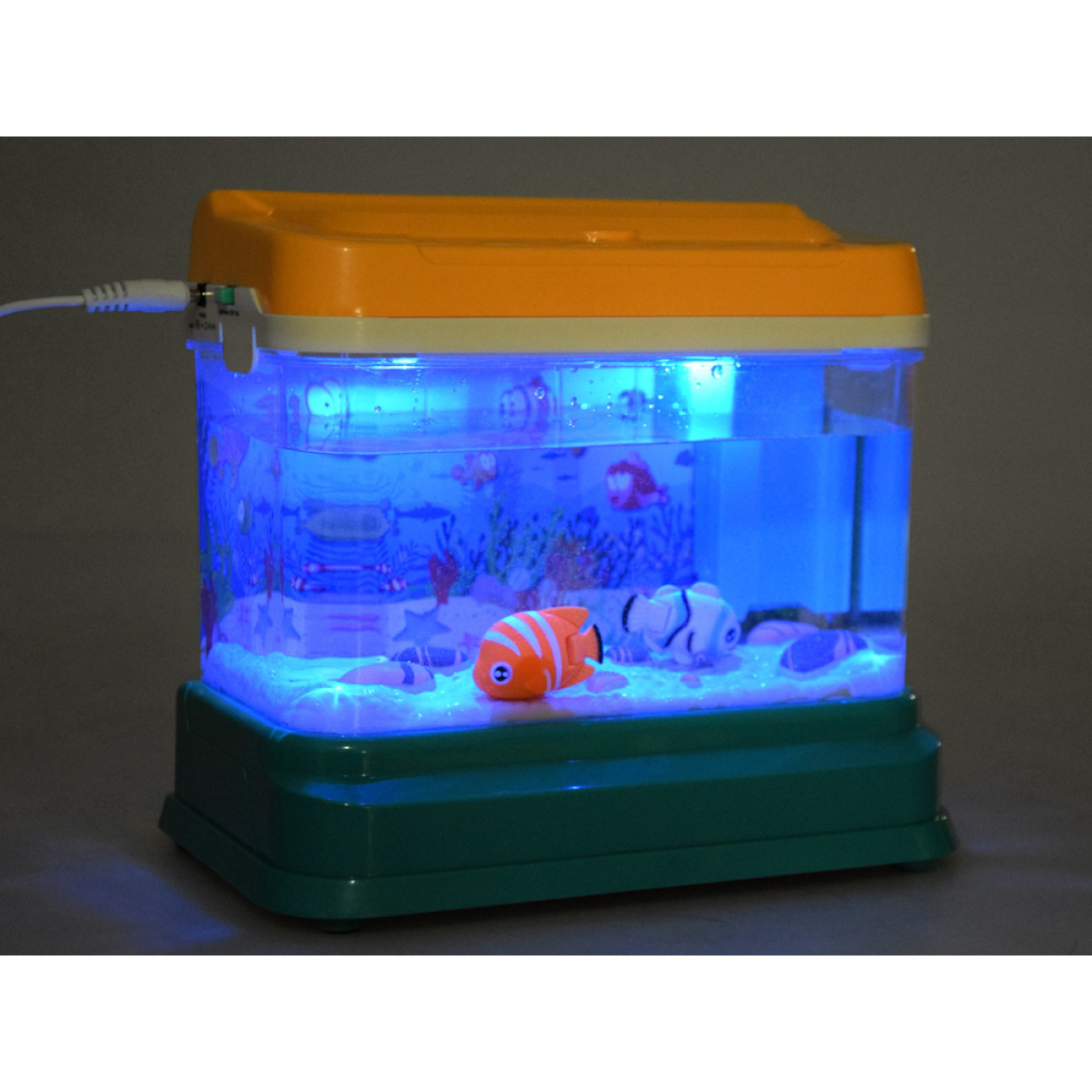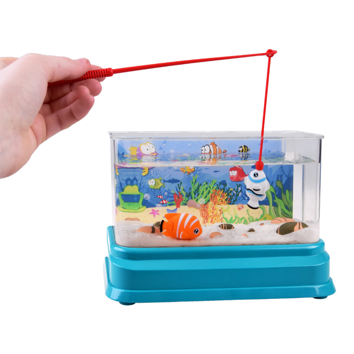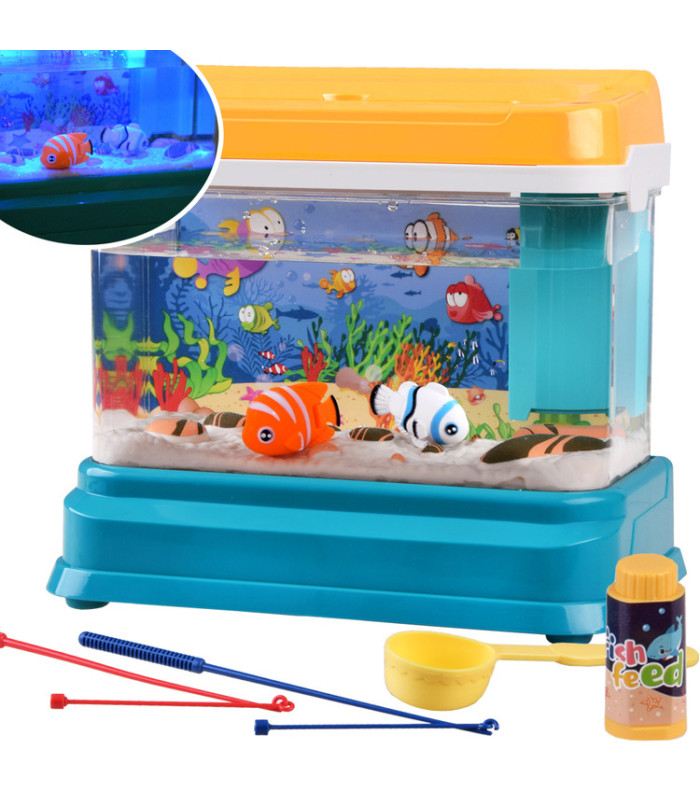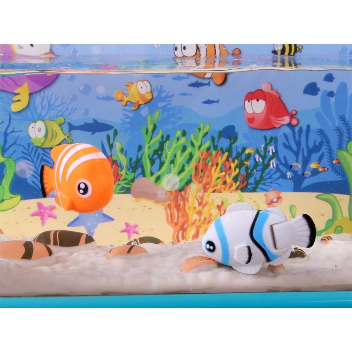 Akvariumas veikia su USB maitinimu. Prijungus žaislą, akvariumas užsidega. Iš viršutinio dangčio teka keturios vandens srovės, sukuriančios burbulus akvariume. Akvariumo dangtis turi jungiklį, kuris įjungia malonią melodiją. Visą laiką akvariume šviečia šviesa, sukurianti labai malonią atmosferą. Komplekte esančios meškerės leidžia vaikui ir tėvams žaisti gaudant žuvis. Žinoma, laimi tas, kas pirmas sugavo žuvis! Idėjų žaidimui su akvariumu galima sugalvoti daug.