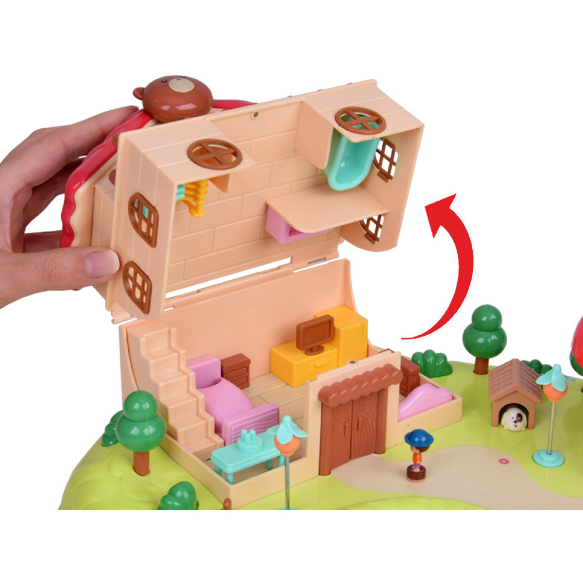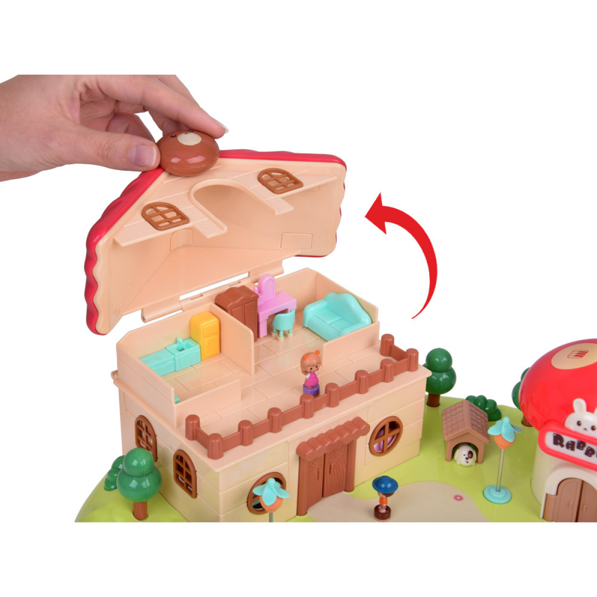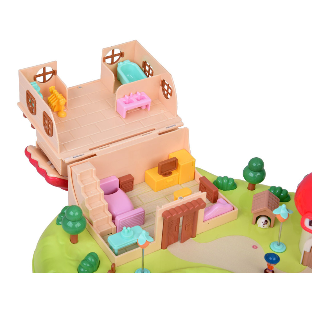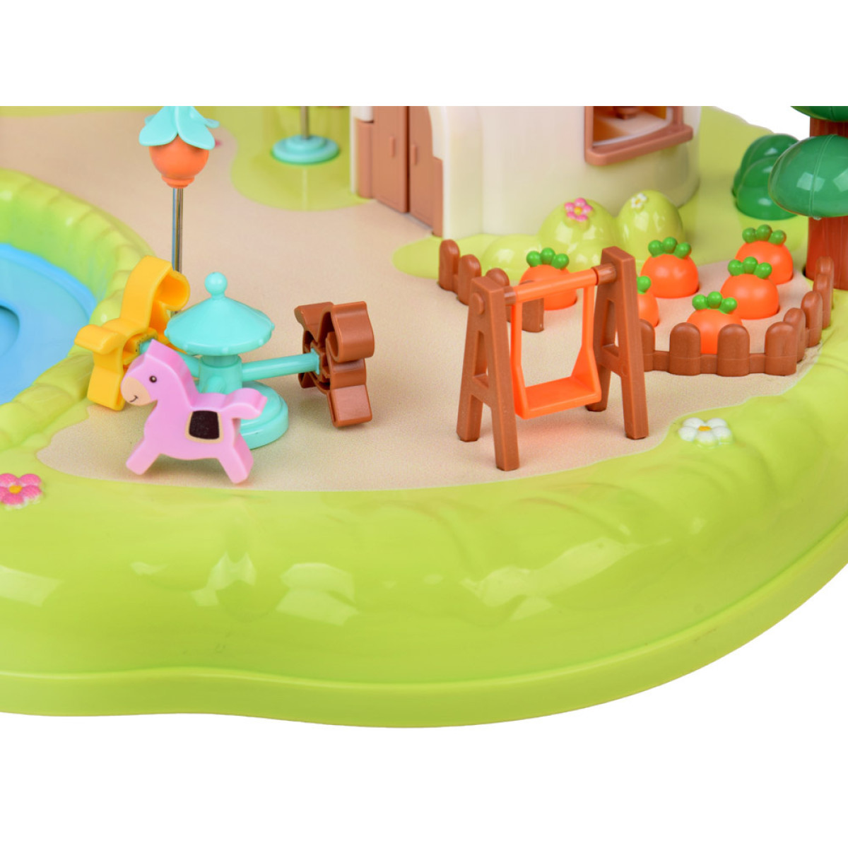 Komplekts attēlo krāsainu ainu ar jauku, atveramu māju, sēnes formas veikalu un rotaļu laukumu, kas ieskauts ar kokiem, burkānu dobi un citiem jaukiem sīkumiem. Rotaļlieta ir aprīkota ar skaņas un gaismas efektiem, kas noteikti ievērojami uzlabos spēli.