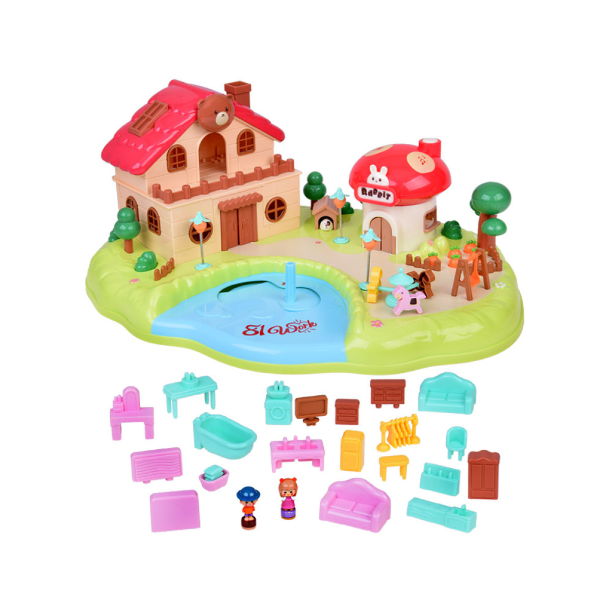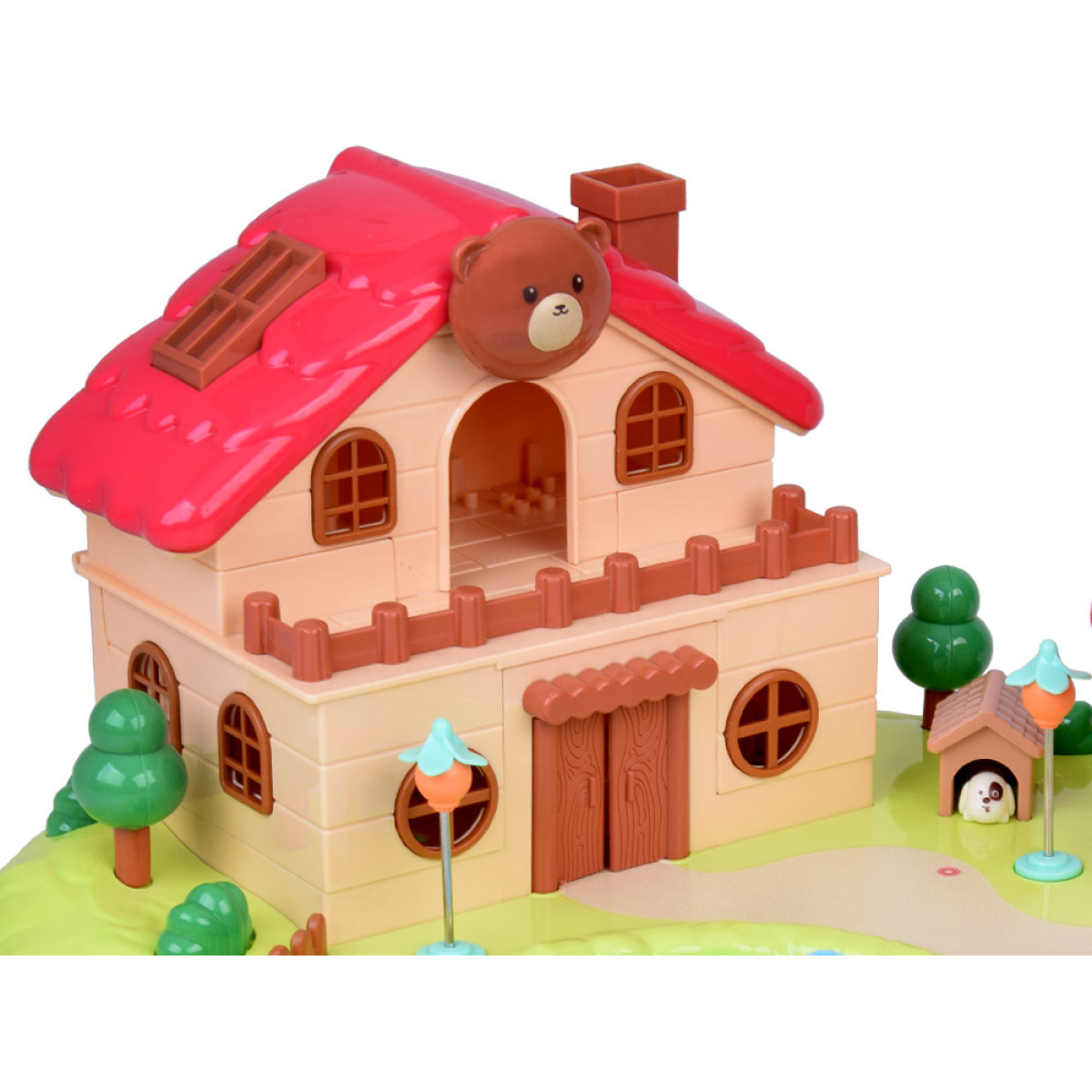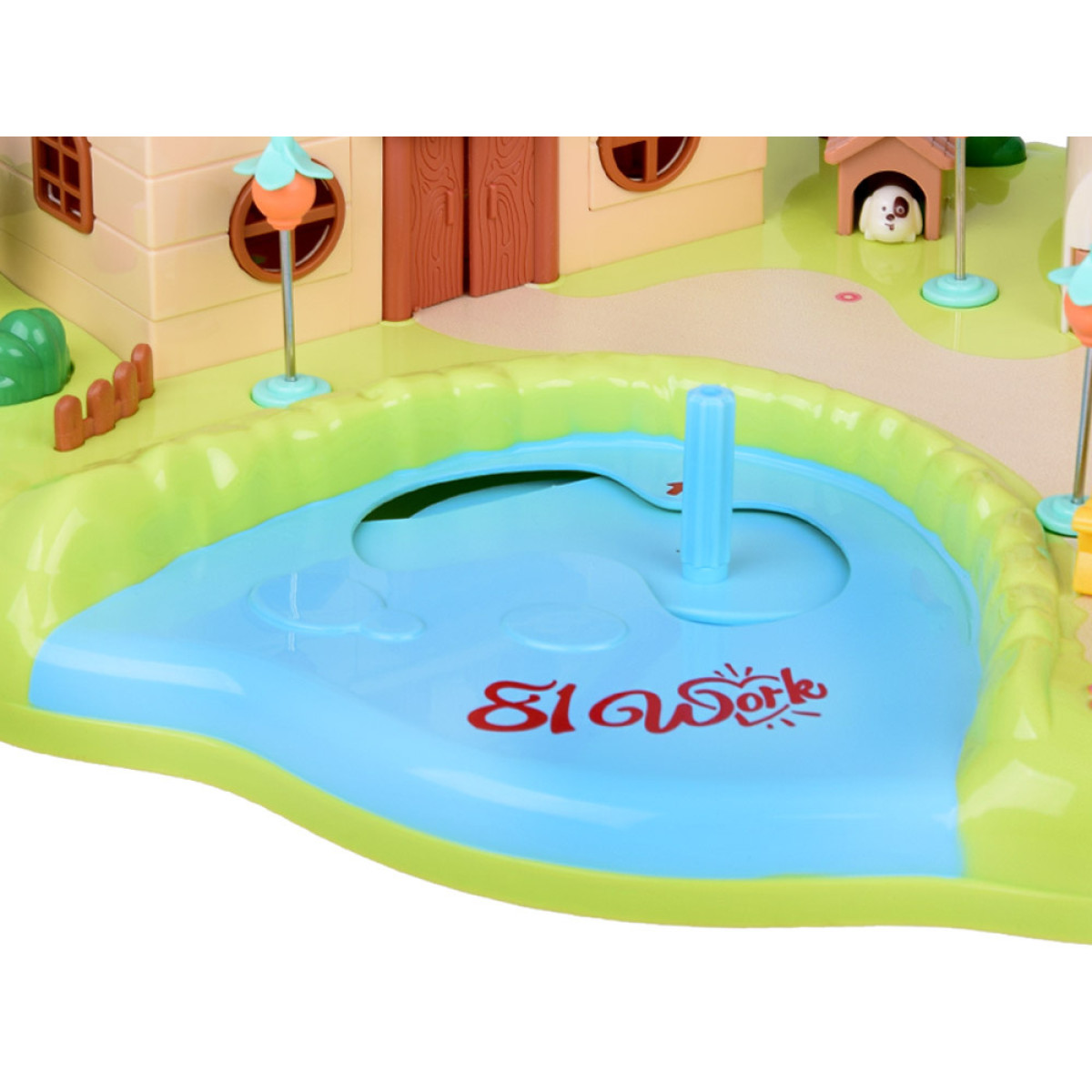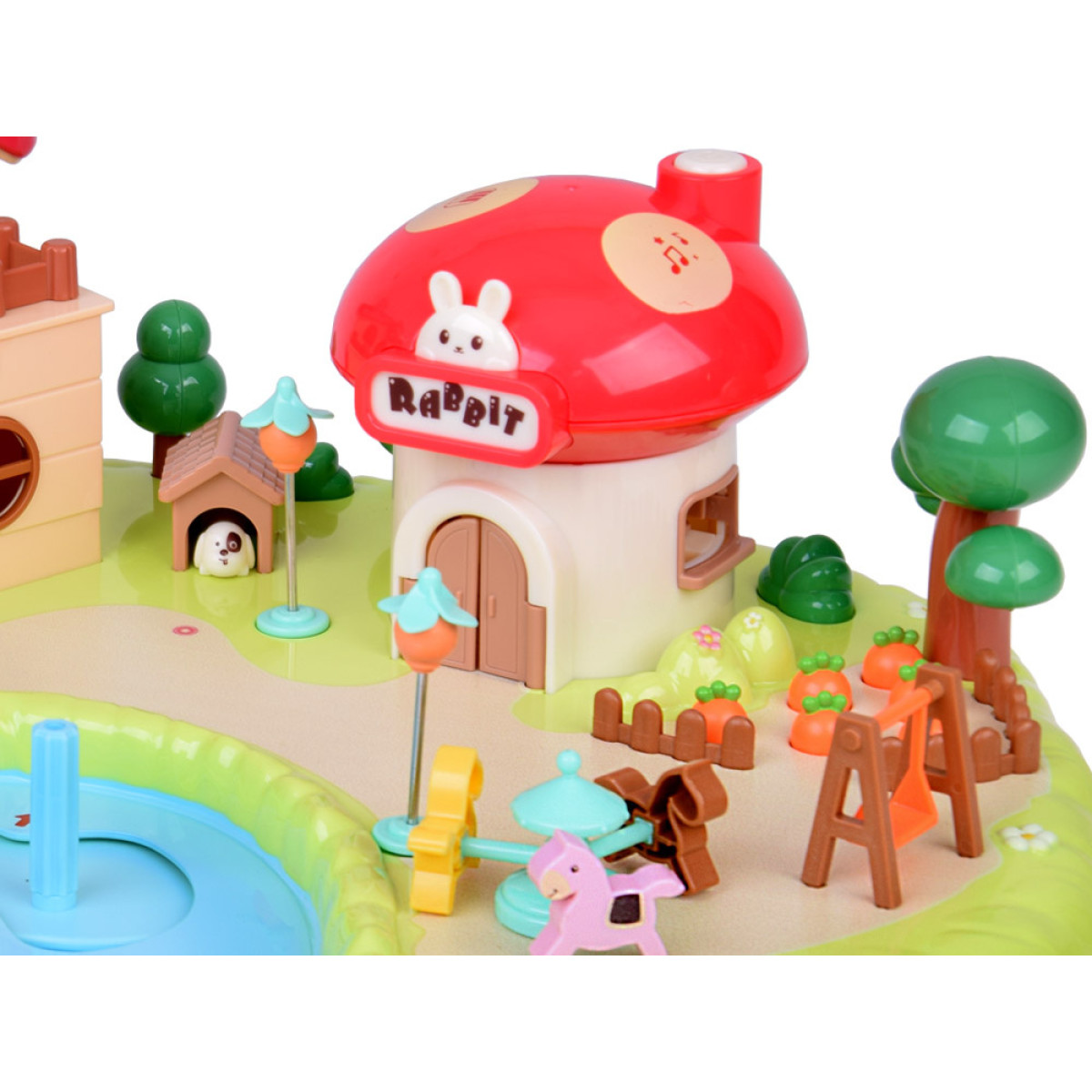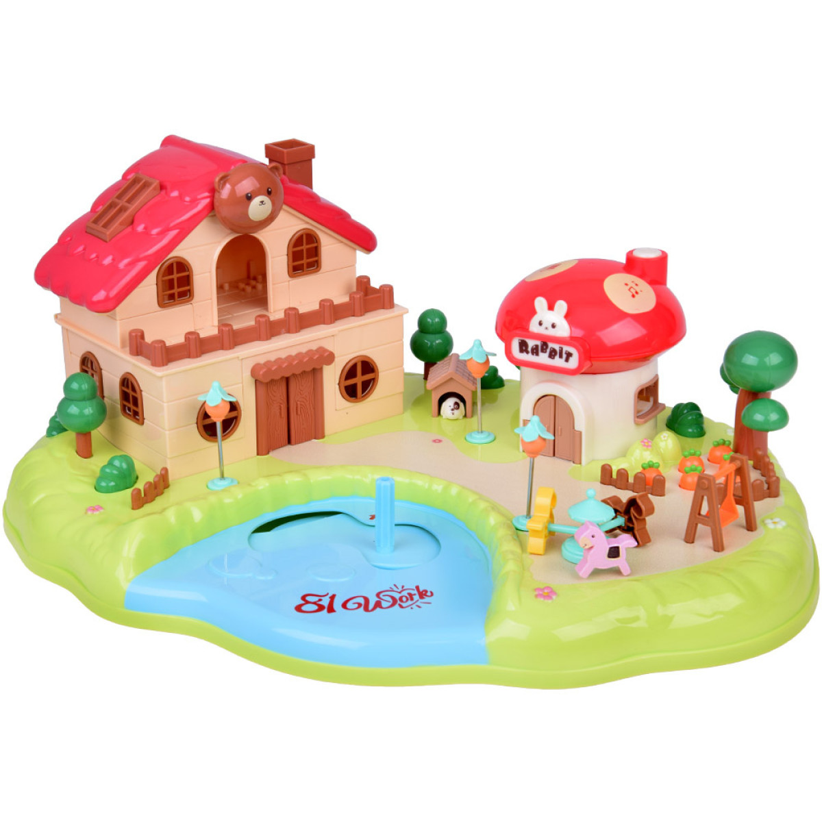 Komplekts attēlo krāsainu ainu ar jauku, atveramu māju, sēnes formas veikalu un rotaļu laukumu, kas ieskauts ar kokiem, burkānu dobi un citiem jaukiem sīkumiem. Rotaļlieta ir aprīkota ar skaņas un gaismas efektiem, kas noteikti ievērojami uzlabos spēli.
