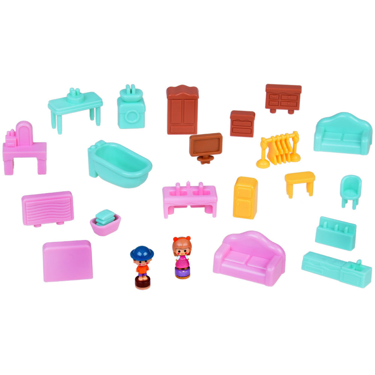 - Elementi: Komplektā ir mēbeles un dekorācijas, kuras var brīvi izvietot.