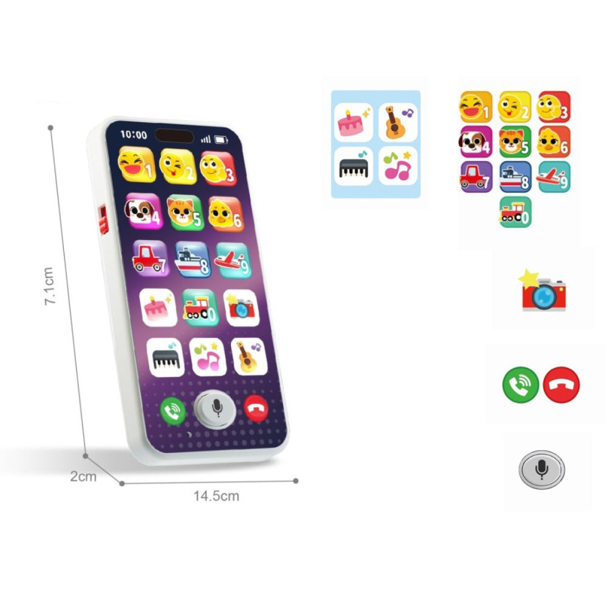 Ja tavs bērns bieži skatās uz vecāku tālruni un vēlas to izmantot, šis krāsainais, interaktīvais tālrunis būs lielisks risinājums. Rotaļlieta ir izstrādāta tā, lai izskatās un darbojas līdzīgi kā īsts viedtālrunis, bet ir pilnīgi droša un piemērota mazām rokām. Tā ir plakana, ērta un viegla, tāpēc lieliski piemērota lietošanai mājās vai ceļojumos.