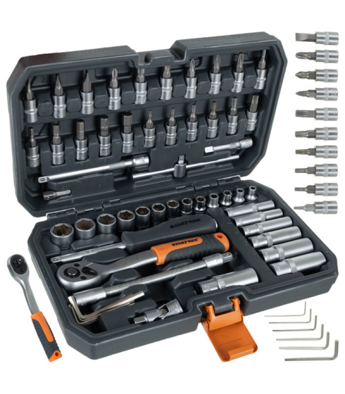 Bigstren 56 gabalu instrumentu komplekts ir profesionāls risinājums, kas piemērots darbnīcām, servisiem un automašīnām. Komplekts ietver plašu sortimentu ar uzmavām, bitu galiem, pagarinājumiem un aksesuāriem, kas palīdzēs veikt dažādus remonta darbus.