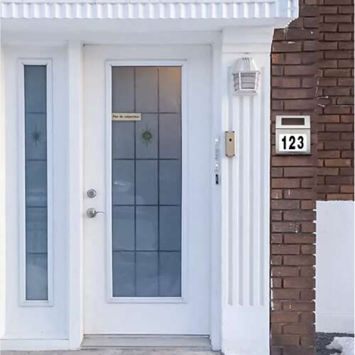 - Burti un cipari komplektā, viegla uzstādīšana – komplektā ietilpst trīs pašlīmējošu ciparu (0-9) loksnes un viena mazo burtu (a-h) loksne, kas viegli pielīmējamas uz apgaismotā stikla. Komplektā ir arī divi dībeļi ar skrūvēm numura uzstādīšanai uz jebkuras virsmas.
