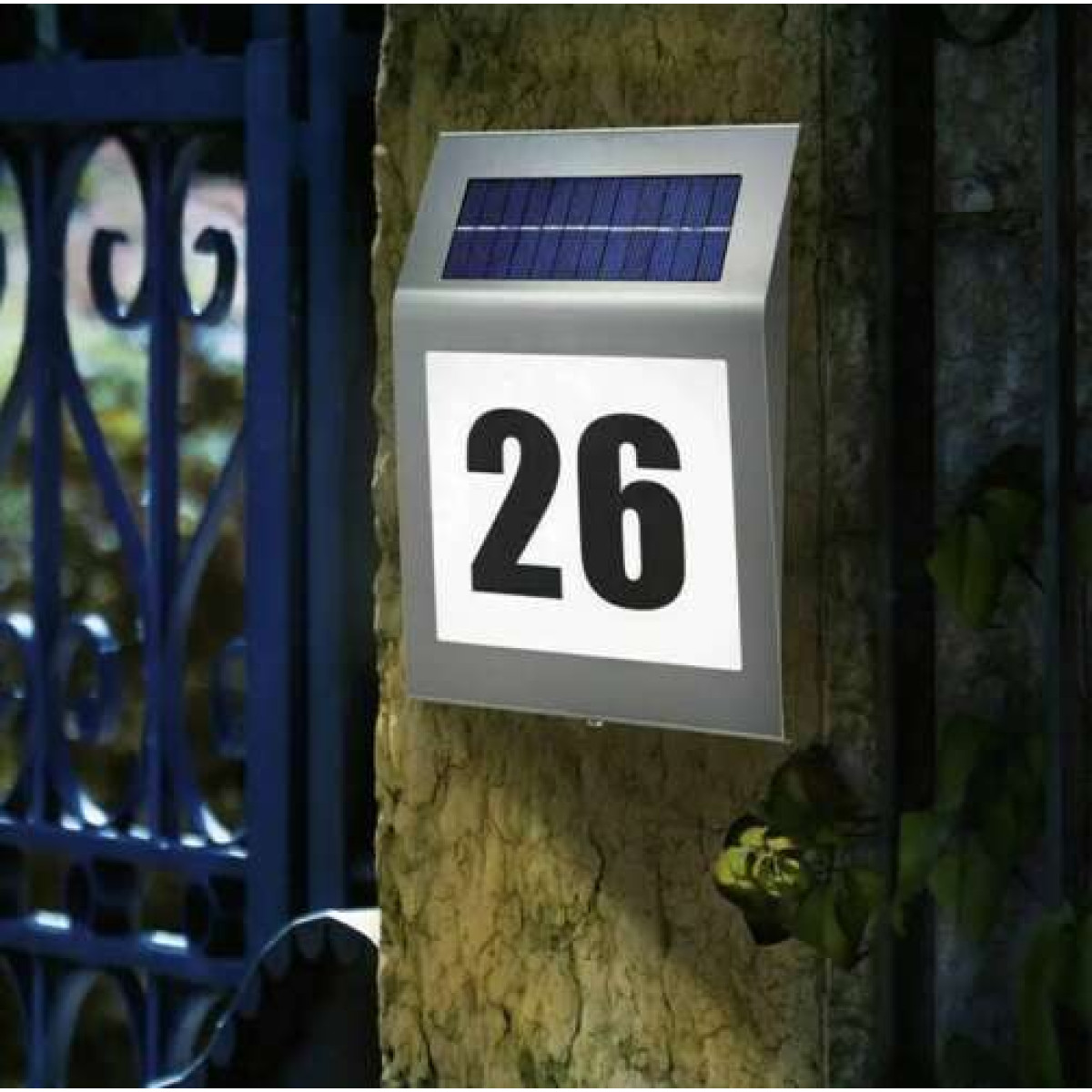 - Saules uzlādēts apgaismojums un krēslas sensors – saules panelis uzlādē komplektā iekļauto akumulatoru, kas nodrošina divu efektīvu LED spuldžu darbību, padarot numuru labi redzamu vakarā un agrā rītā. Apgaismojumu ieslēdz krēslas sensors, kas reaģē uz gaismas intensitātes izmaiņām.