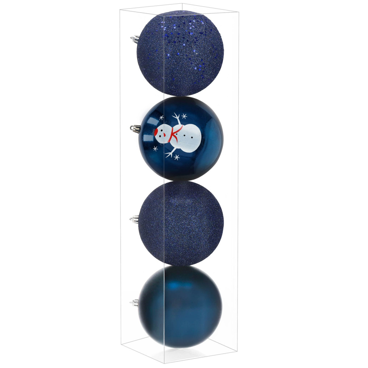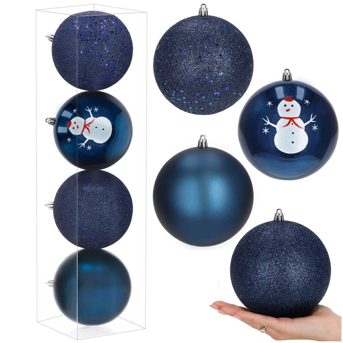 Pamati dati Zīmols: Springos® Materiāls: plastmasa Krāsa: zils, balts Komplektā: 4 gab. Nesalaužamas bumbas Veids: pusmatētas / ar mirdzumu / spīdīgas Forma: apaļa Komplektā ietilpst: 2x bumba ar mirdzumu 1x pusmatēta bumba 1x spīdīga bumba ar dubultpusēju sniegavīra motīvu Izmēri: Kopējais diametrs: 12 cm Diametrs bez pakaramā: 11 cm