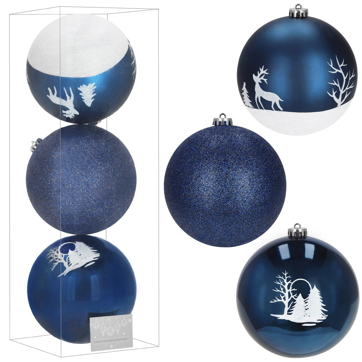 Pamata dati Zīmols: Springos® Materiāls: plastmasa Krāsa: zils, balts Komplektā: 3 gab. Nesaplīstošas bumbas Ar aukliņām pakarināšanai komplektā Veids: pusmatētas / spīdīgas ar gliteriem / spožas Forma: apaļa Komplektā ietilpst: 1x gliteru bumba 1x pusmatēta bumba ar divpusēju Ziemassvētku motīvu 1x spīdīga bumba ar divpusēju Ziemassvētku motīvu Izmēri: Kopējais diametrs: 15 cm Diametrs bez aukliņas: 14 cm