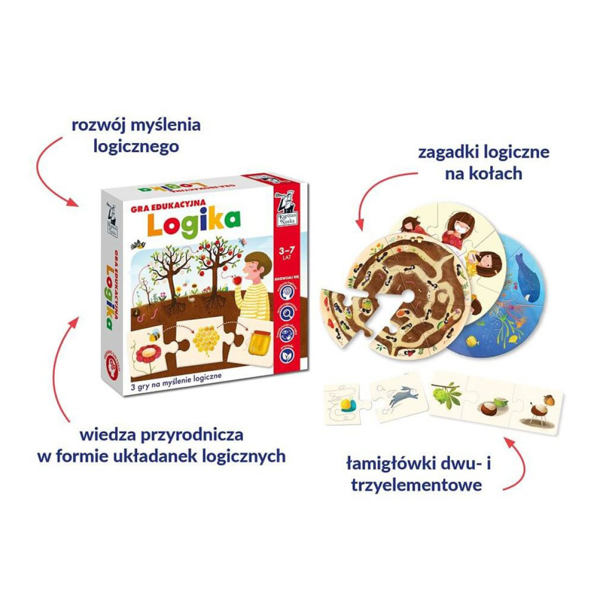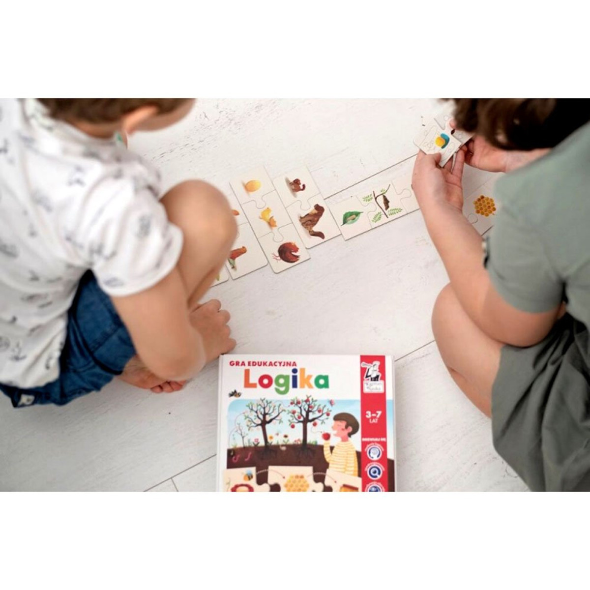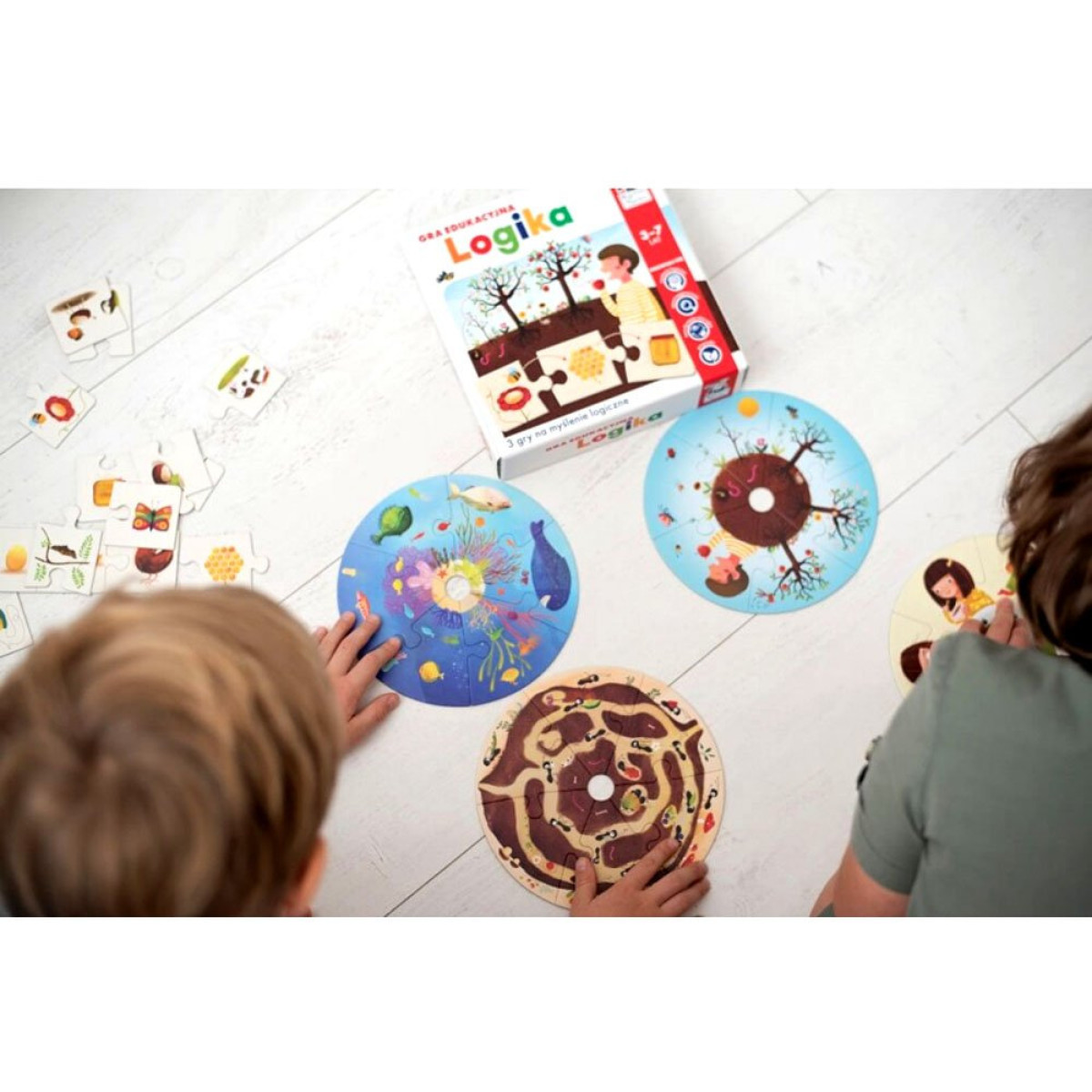 Izglītojošā spēle „Loģika” (3-7 gadi) ir ideāls piedāvājums zinātkāriem bērniem, kuriem patīk atklāt dabas noslēpumus, veidot puzles un risināt mīklas. Komplektā ietilpst 8 sešu elementu puzles apaļā formā, kas māca par dienas un gadalaikiem, kā arī dažādām dzīvnieku sugām, un 8 divu un trīs elementu puzles, kas attēlo pretstatu un cēloņu-seku attiecības.