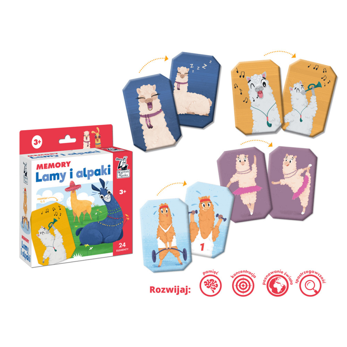 Atmiņas Spēle Lamas un Alpakas ir vienkārša spēle, kas apvieno atmiņas treniņu ar pievilcīgu tematiku. Bērni ir iesaistīti spēlē, kas aktivizē viņu iztēli, kā arī trenē koncentrēšanās spējas un uzmanību. Kā spēlēt? Pietiek atrast un saskaņot flīzes, kas attēlo tos pašus dzīvnieku pārus dažādās pozās.