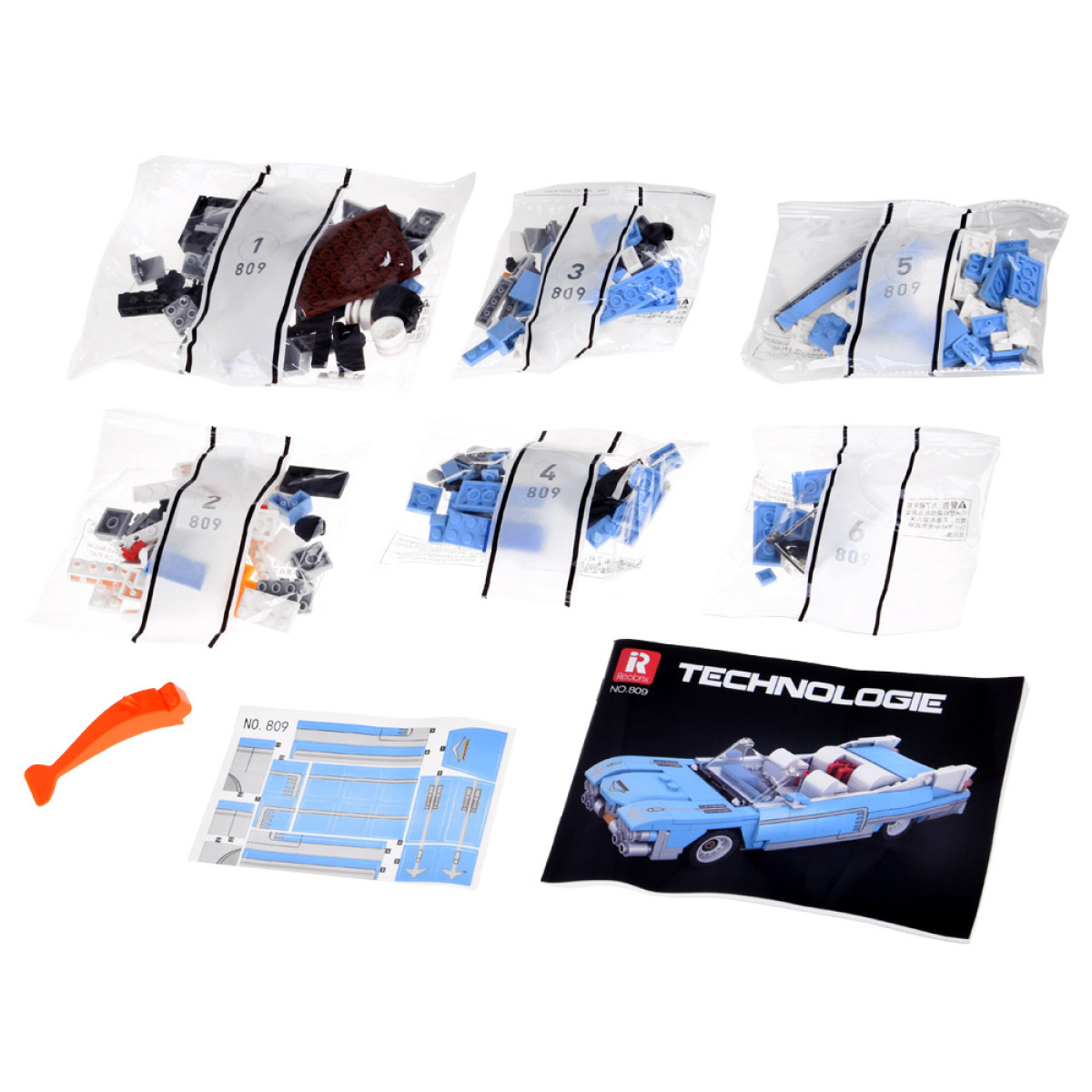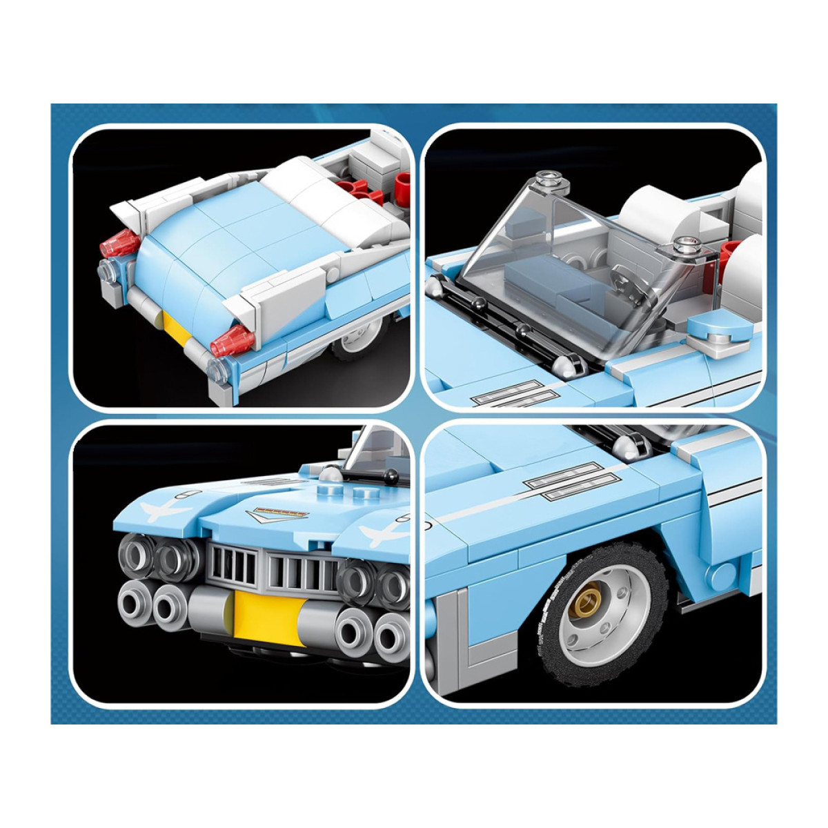 Tehnisko klucīšu komplekts Zilais Kabriolets ir piedāvājums klasisko automašīnu un elegantā dizaina cienītājiem, kas nāk no Amerikas 50. gadu automobiļu pasaules. Modelis pārsteidz ar savu stilu - garu pārsegu, zemu siluetu un raksturīgām, hromētām detaļām, kas atsauc atmiņā luksusa automašīnas no pagātnes.