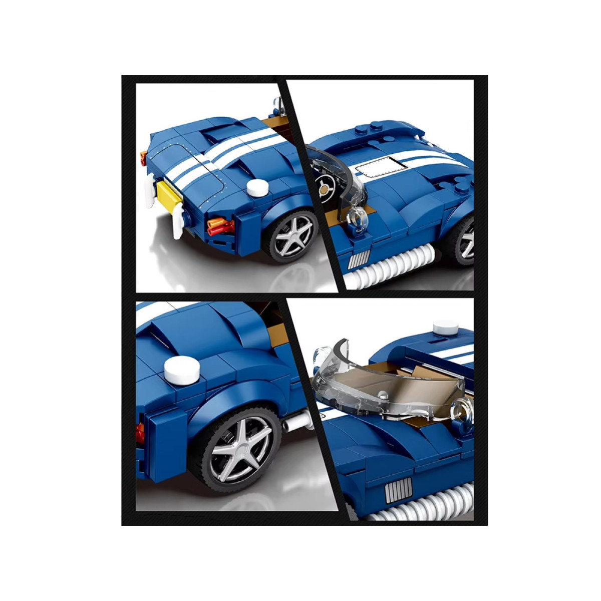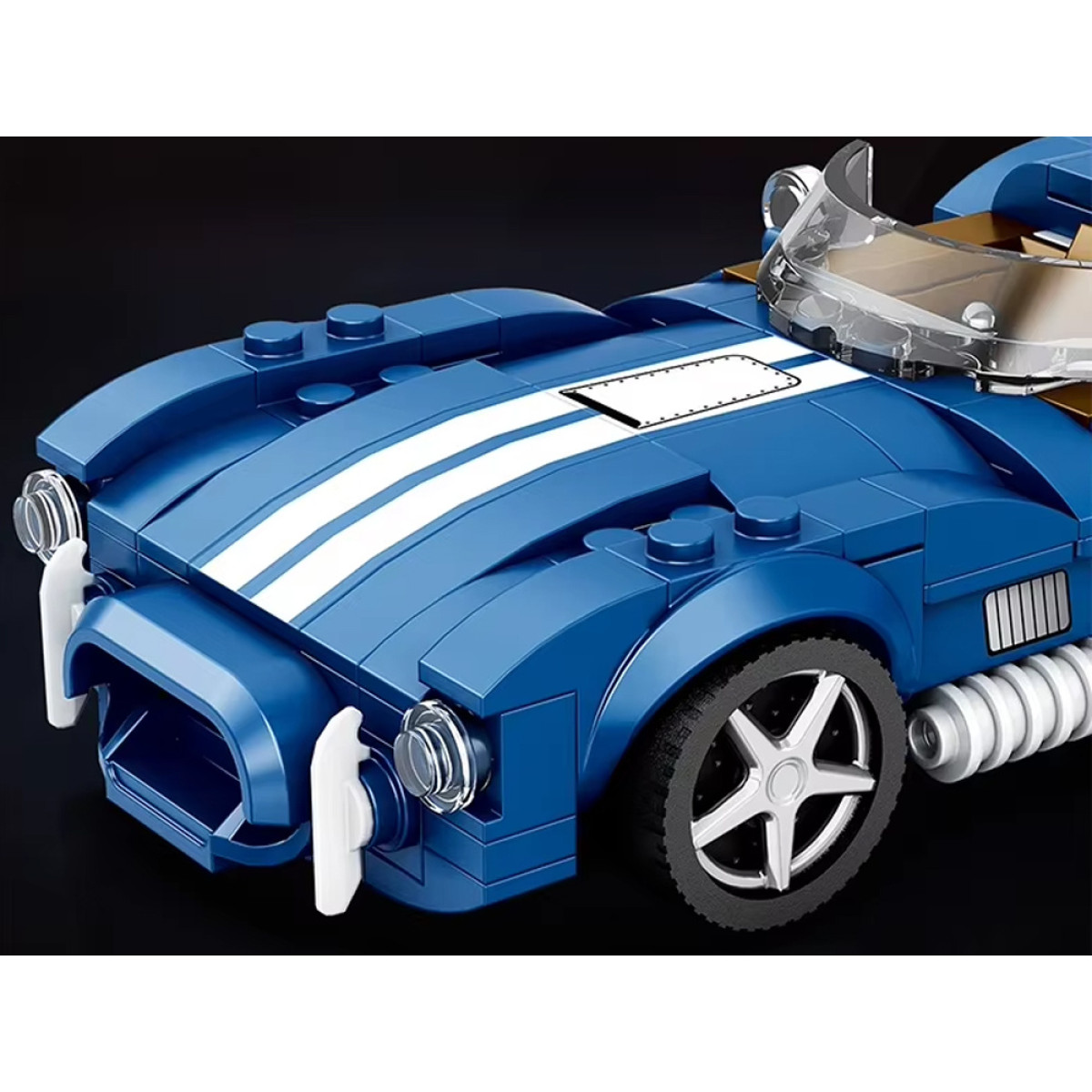 Auto ir intensīvi zilā krāsā, ar kontrastējošiem akcentiem un sportisku apdari. Komplektā ir 312 elementi, kas ļauj izveidot iespaidīgu un stabilu klasiskā rodstera modeli ar precīziem detaļām.