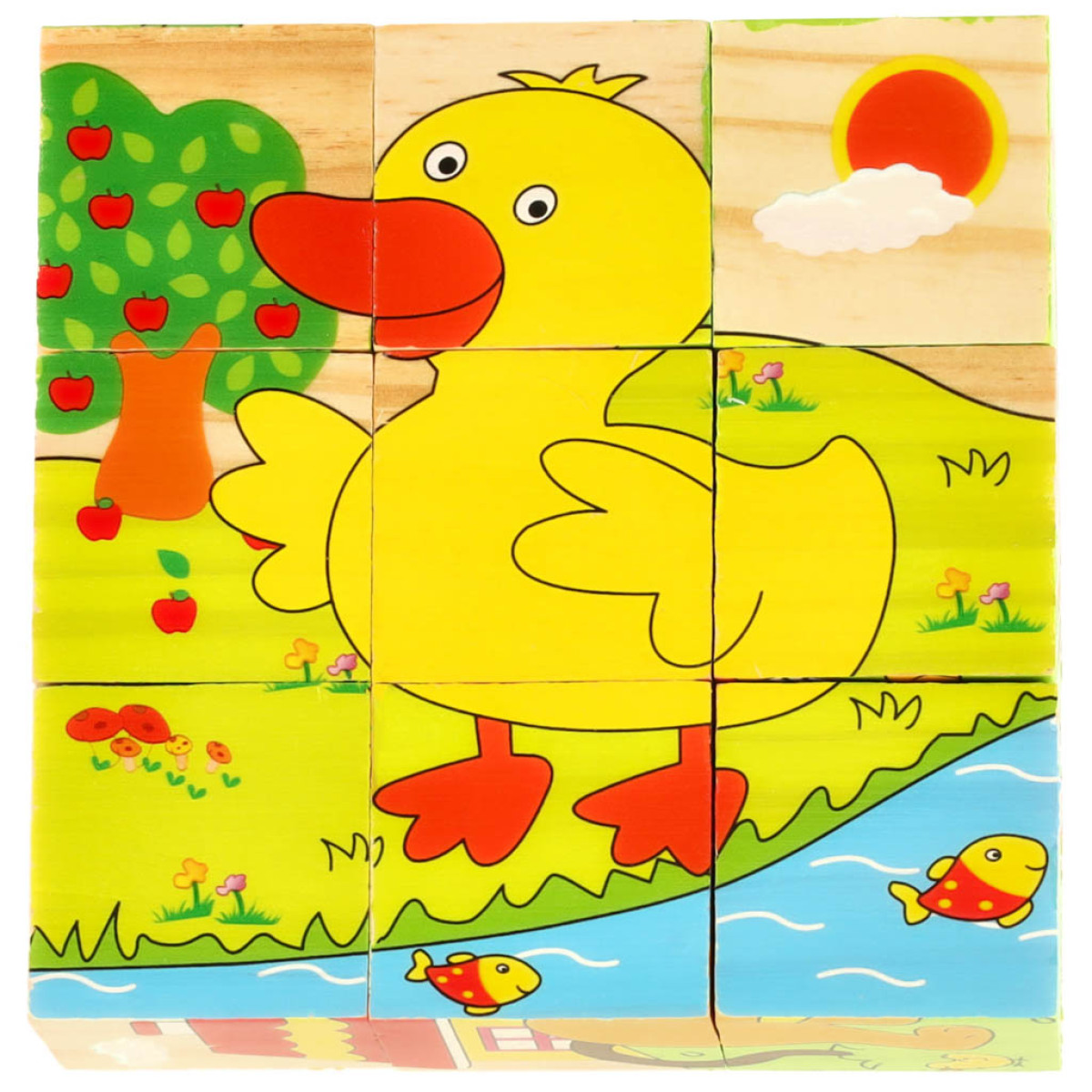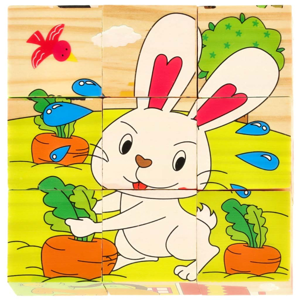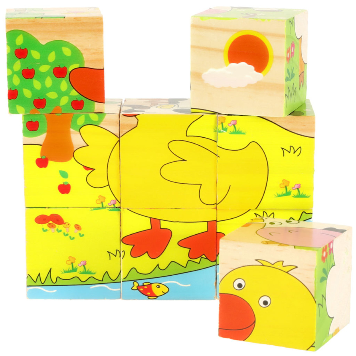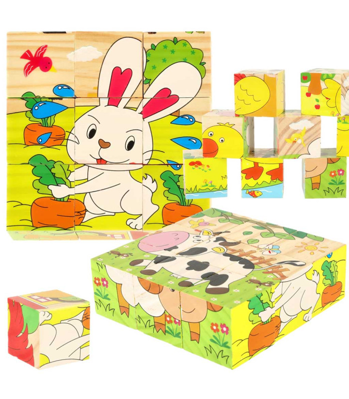 - Unikali dėlionės koncepcija: Šis rinkinys susideda iš 9 medinių kubelių, kurie leidžia sudėlioti net 6 skirtingus paveikslėlius su ūkio gyvūnais. Tai suteikia vaikams daugiau galimybių kūrybiškai mąstyti ir išbandyti skirtingus sprendimus.