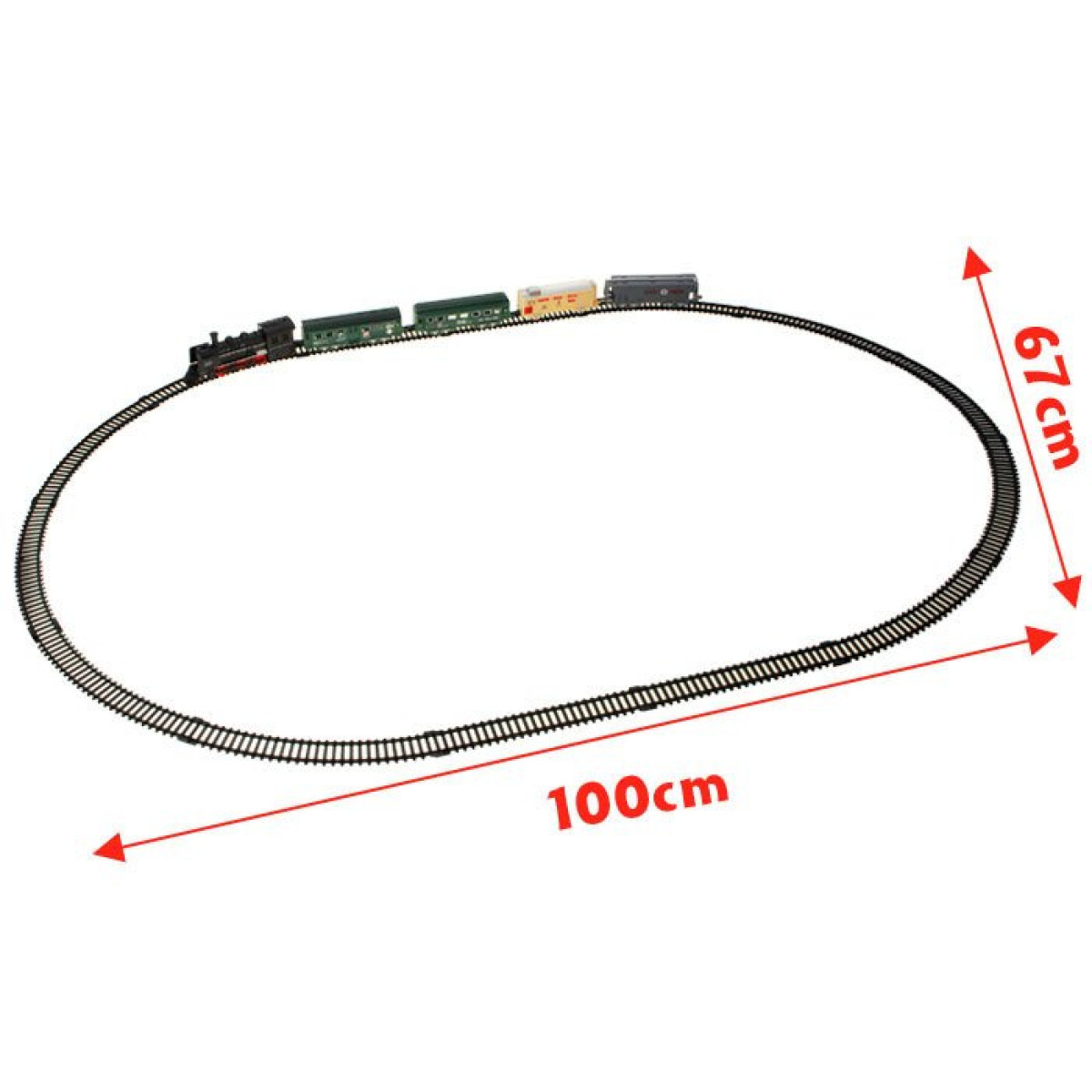 Bateriju barošana (2xAA) nodrošina drošību, jo nav nepieciešams izmantot tīkla barošanas avotu. Lokomotīvi darbina klasisks tvaika lokomotīvs. Komplektā ir 4 vagoni - divi pasažieru un divi kravas vagoni. Visa sastāvdaļa (lokomotīve un vagoni) ir 65cm gara. Pilns sliežu ceļš pēc salikšanas ir 100cm garš un 67cm plats.