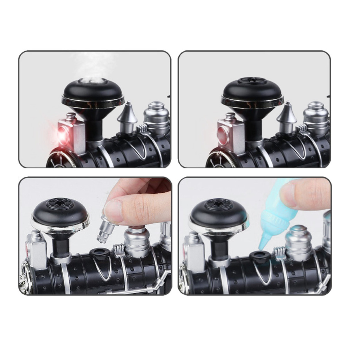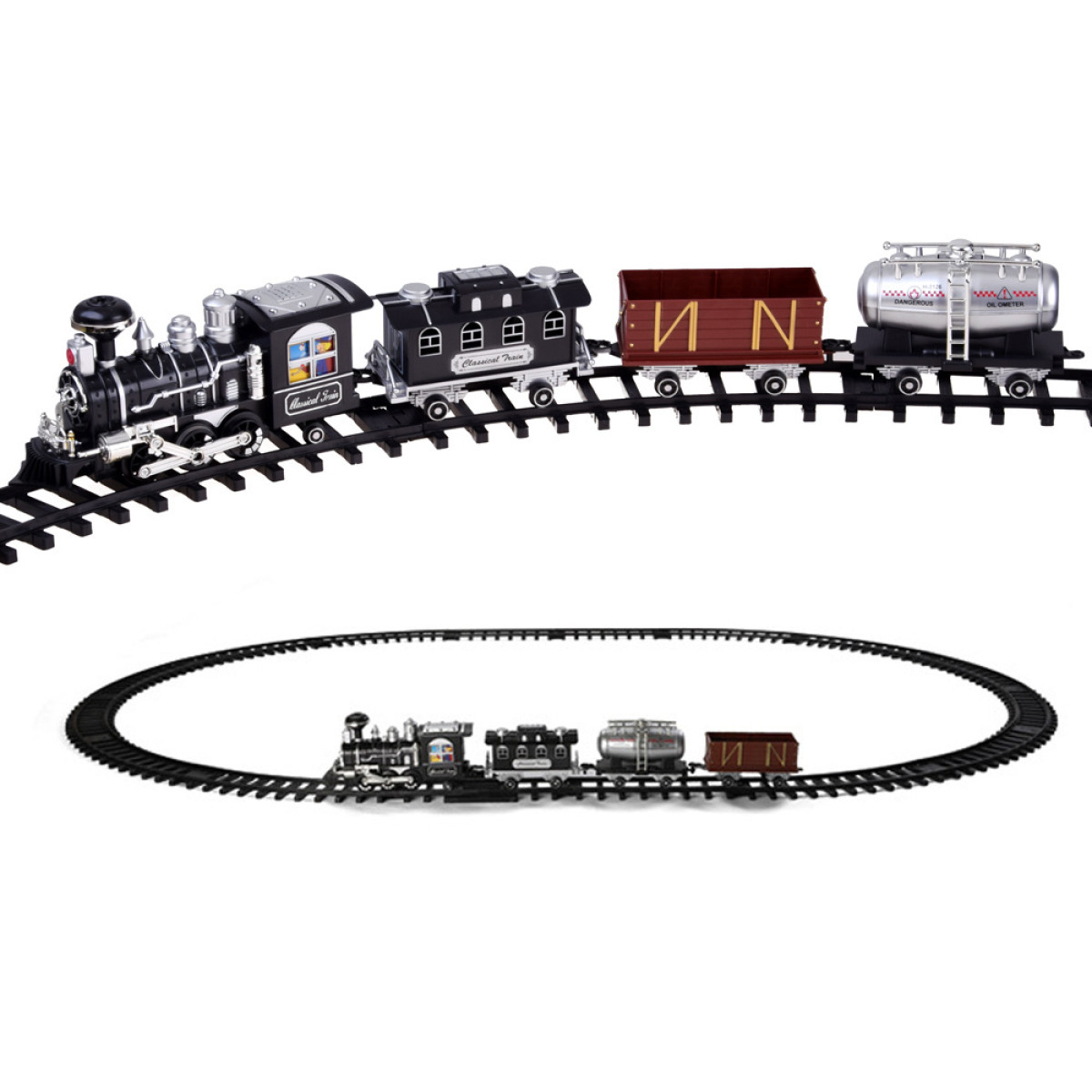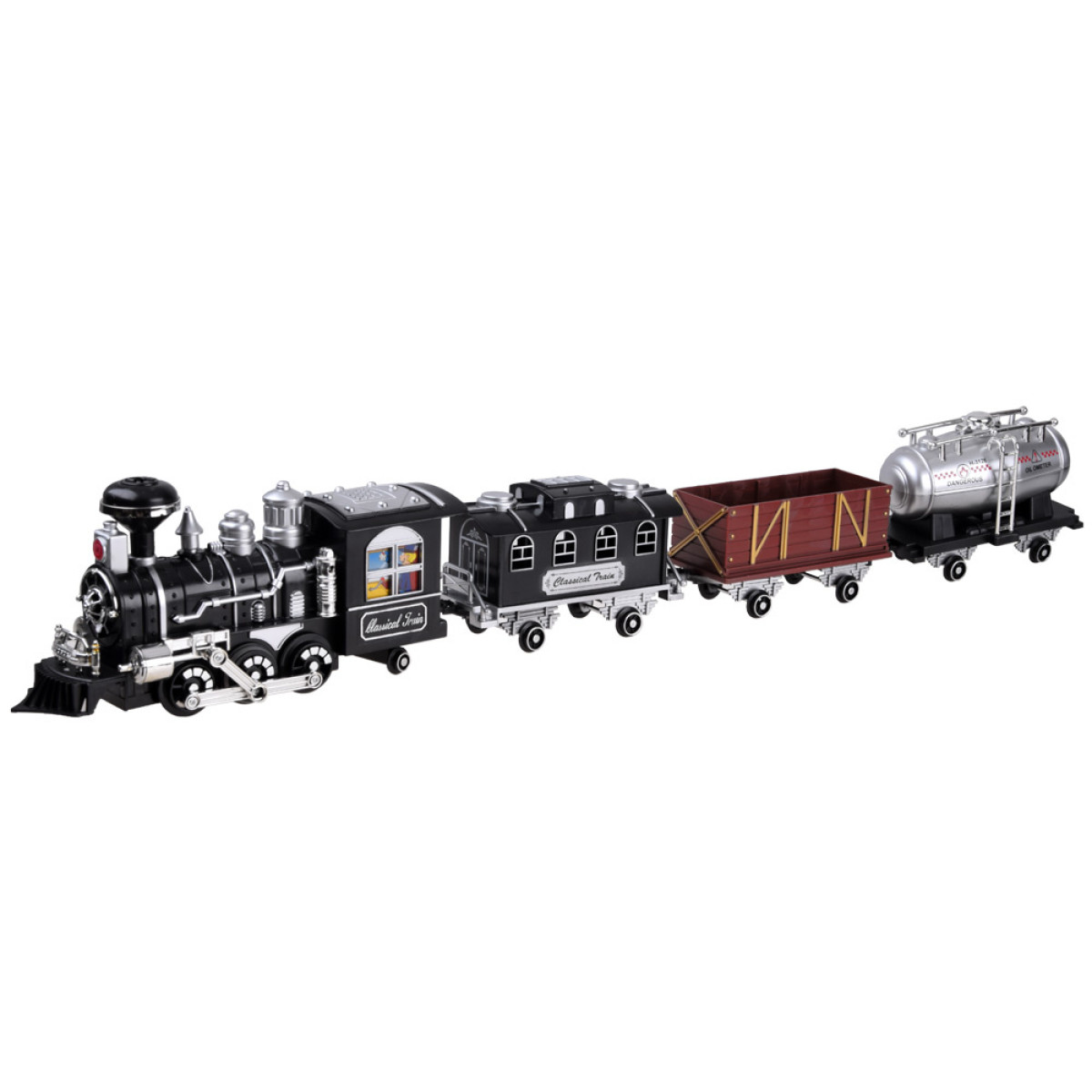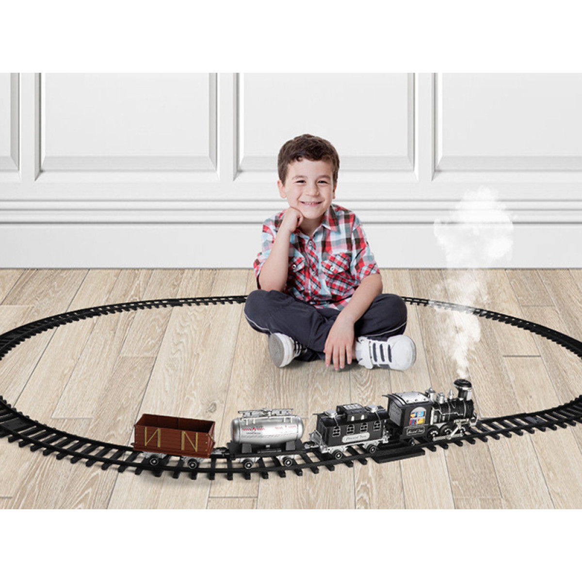 Liela dzelzceļa lokomotīve ar skaņas un gaismas efektiem, dūmojoša no skursteņa, pārsteigs katru mazo mašīnistu. Lokomotīve ir rūpīgi izstrādāta, pievēršot uzmanību sīkākajām detaļām, un to darbina klasisks tvaika dzinējs, kas braucot rada lokomotīves skaņas. Priekšpusē ir brīdinājuma gaisma, un, piepildot tvertni ar ūdeni, no skursteņa sāks izdalīties dūmi, gluži kā īstam tvaika dzinējam. Braucot, lokomotīve rada skaņas, kas raksturīgas braucošam vilcienam: svilpe, ratu klaudzēšana, zvans utt. Šis brīnišķīgais dzelzceļa modelis ar vagoniem noteikti iepriecinās katru jauno modeļu dzelzceļu fanu.