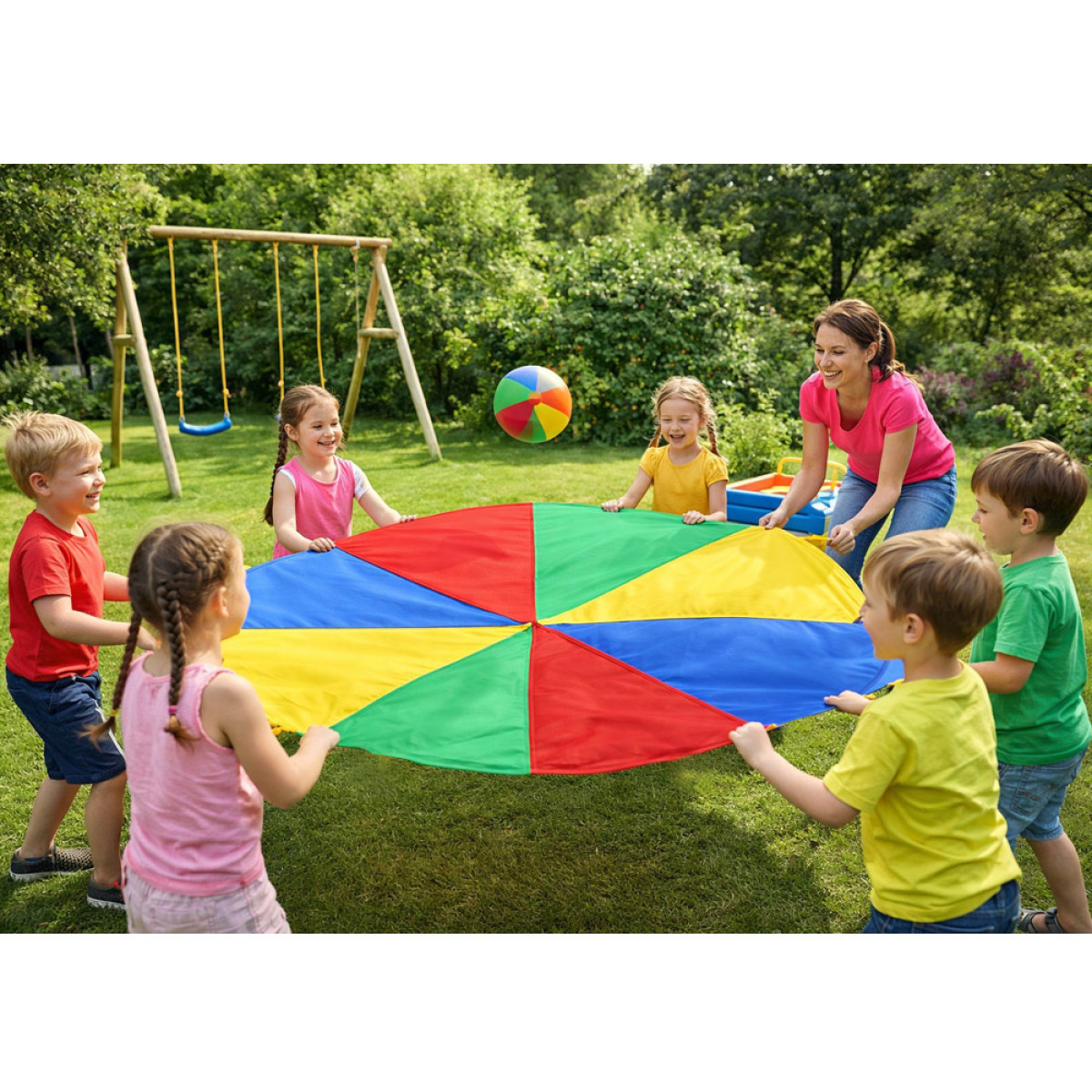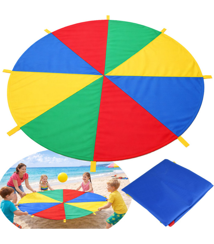 Šalles diametrs ir aptuveni 2 metri, un tai ir 8 ērti rokturi, tāpēc tā ir piemērota kopīgām rotaļām lielākā bērnu grupā. Spilgtās varavīksnes krāsas piesaista uzmanību un mudina bērnus kustēties, sadarboties un iesaistīties rotaļās.
