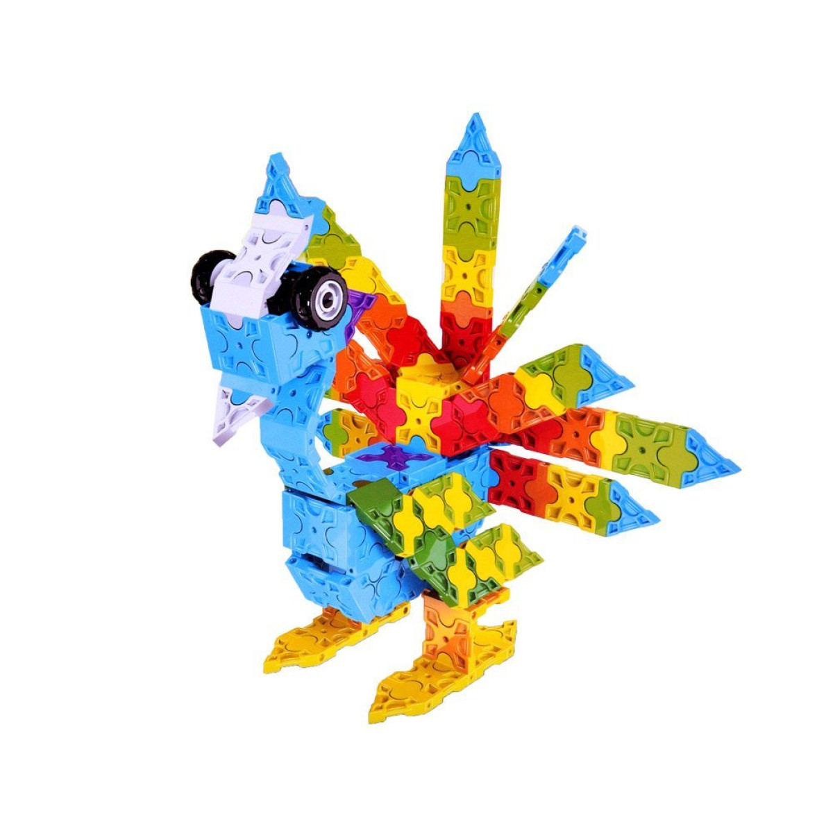Radošs un krāsains 3D kluču komplekts ļauj veidot telpiskus konstrukcijas, piemēram, attēla iepakojumā redzamo skaisto pāvu.