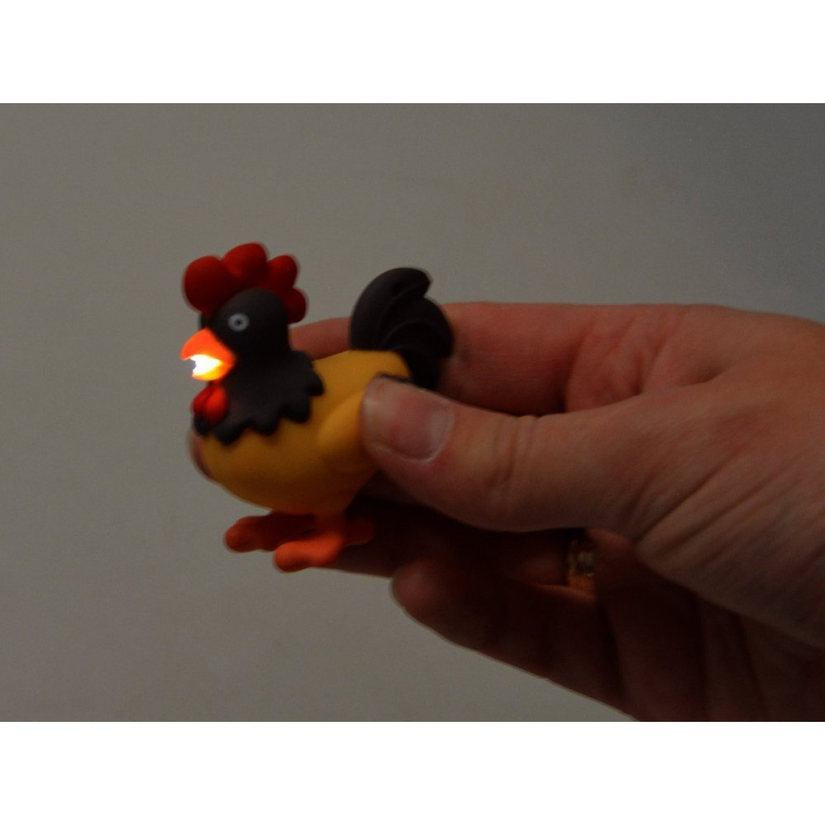 - Iedegas un dzied – nospiežot, gailis izdot gaiļa skaņu un spīd spilgtā gaismā.
