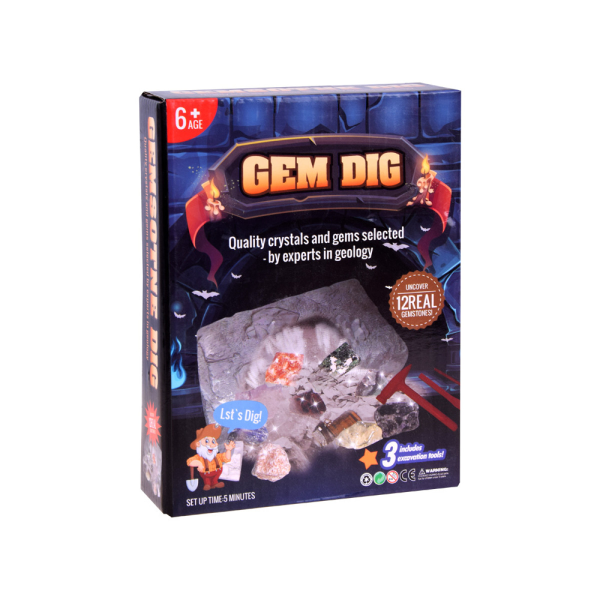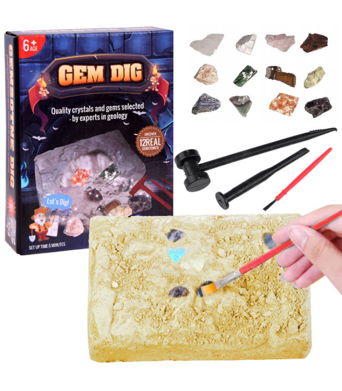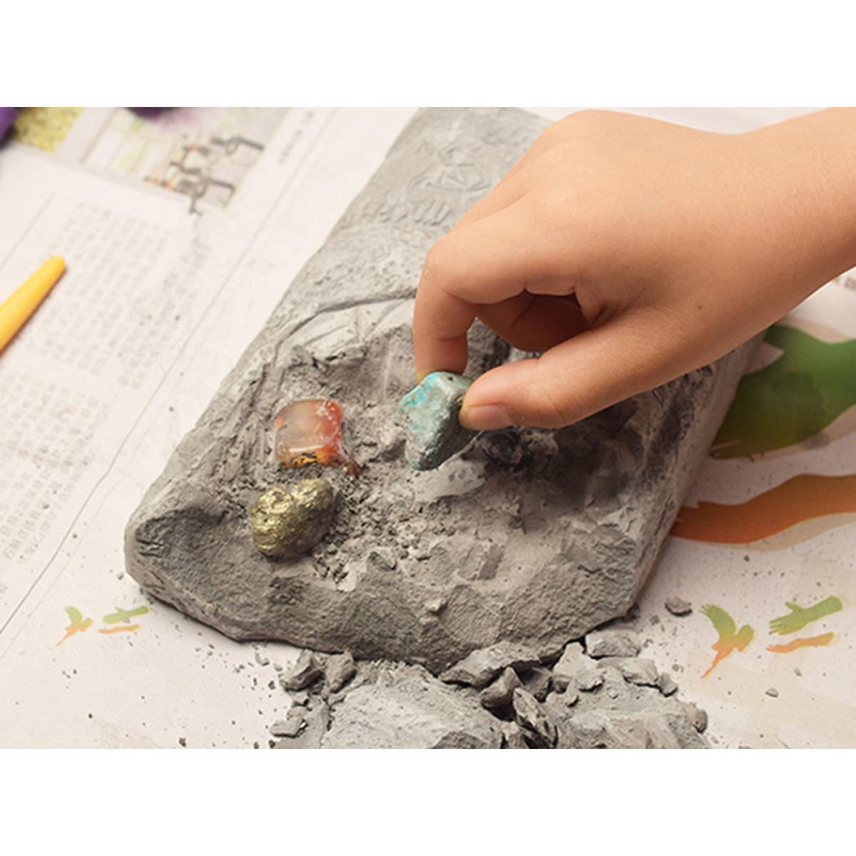 Izglītojošs komplekts mazajam arheologam un dārgumu meklētājam. Akmens ieguves komplekts ir lielisks katram mazajam pētniekam un izrakumu atklājējam. Šī rotaļlieta ir pašizgatavojama, simulējot arheoloģiskos izrakumus jaunā, unikālā un pievilcīgā formā. Atklājēja uzdevums ir ar āmuru, kaltu un otu izņemt ģipša liejumā paslēptos dārgakmeņus.