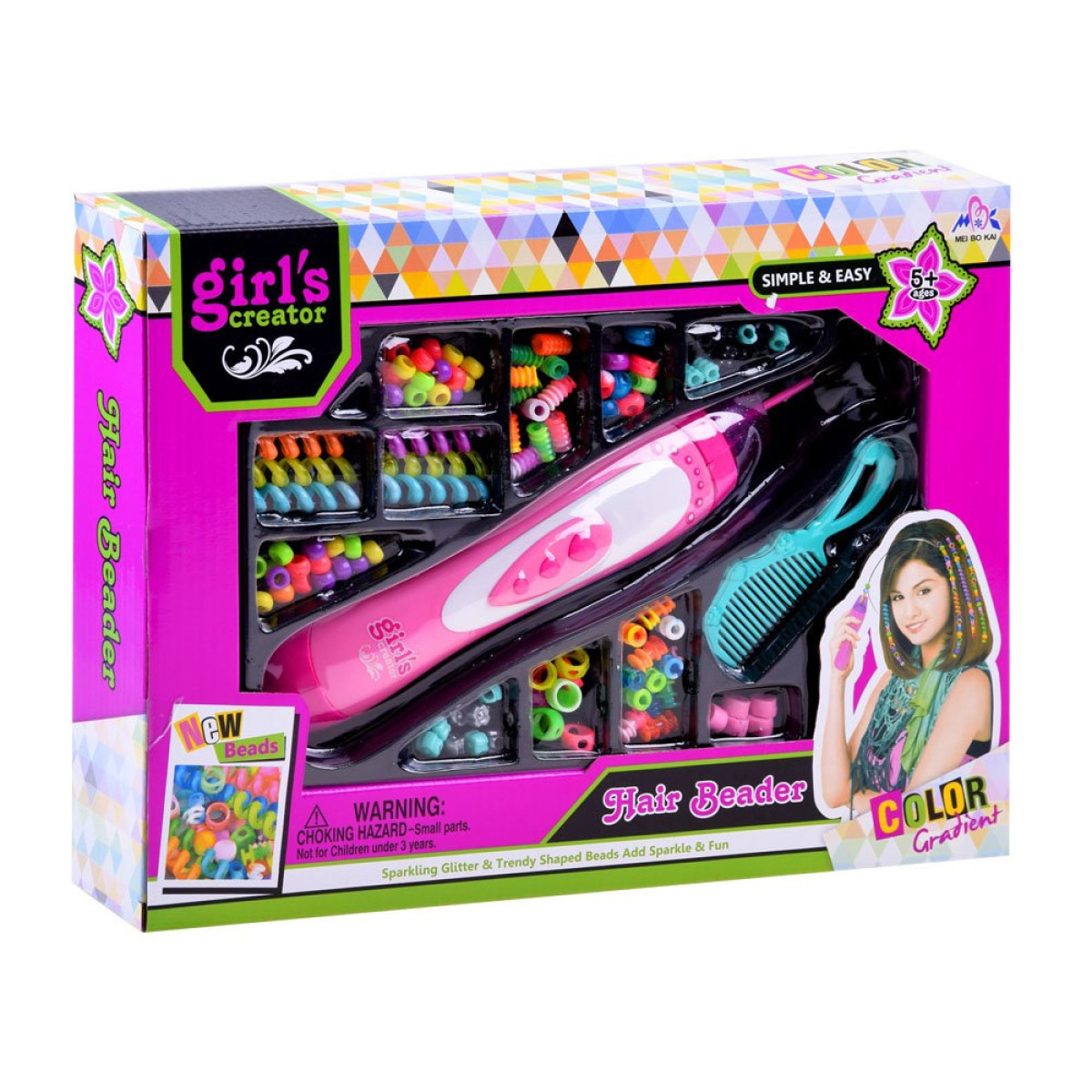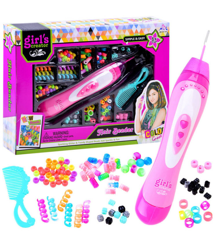 Matu stilizācijas komplekts ar pīšanas mašīnu un modernām krellēm noteikti patiks katrai meitenei. Pīšanas mašīna ļoti atvieglo kreļļu uzlikšanu uz matu šķipsnām. Var bez piepūles radīt apbrīnojamus, krāsainus šķipsnas un brīnišķīgus, efektīvus matu sakārtojumus. Pateicoties dažādiem elementiem, mazā modes dāma katru dienu izmantos citu oriģinālu ideju matu stilizācijai. Komplekts garantē brīnišķīgu izklaidi kopā ar vecmāmiņu, mammu, māsu vai draudzeni.