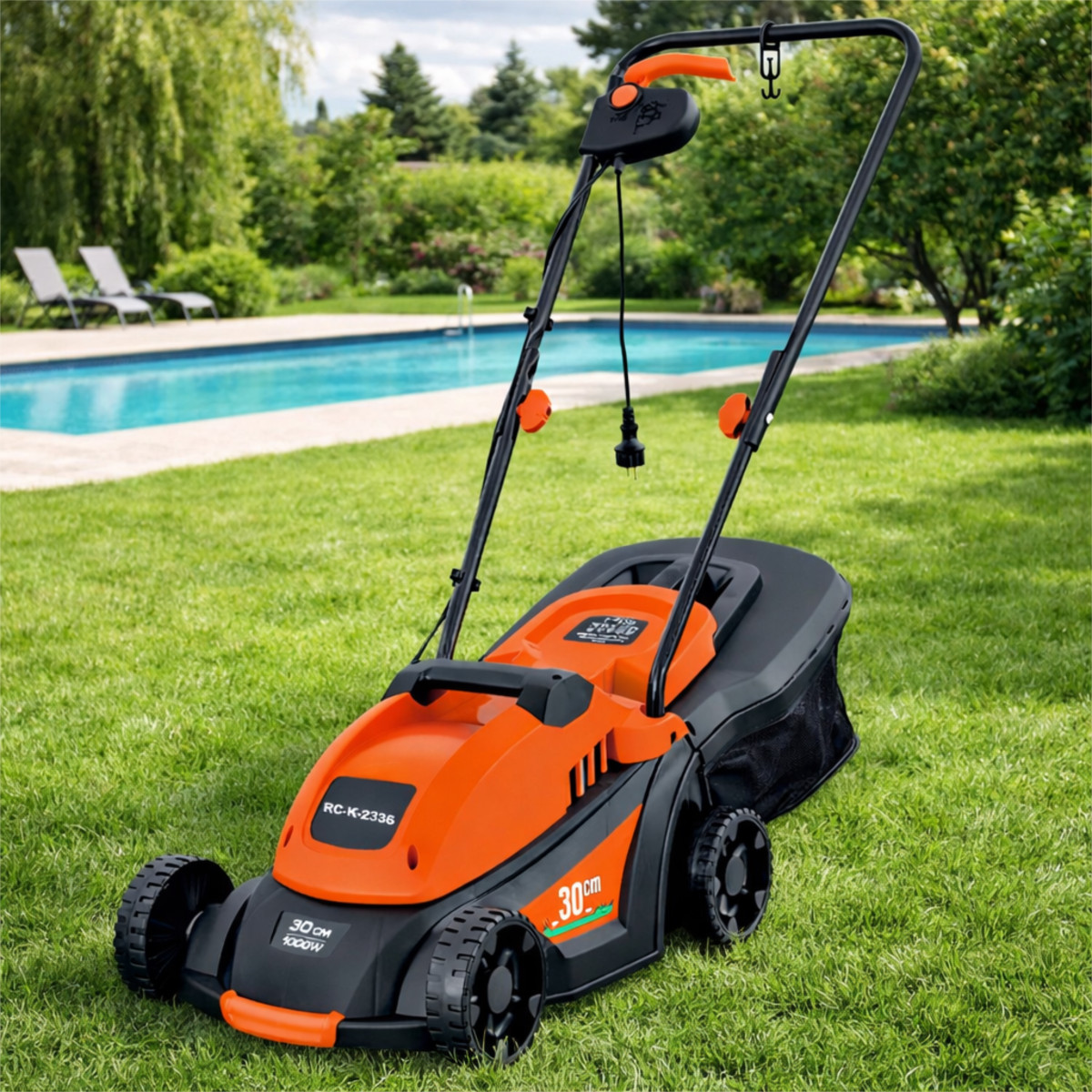 Elektriskais zāles pļāvējs viegls un jaudīgs zāles pļaušanai ar lielu 35L tvertni un 1000W jaudu.