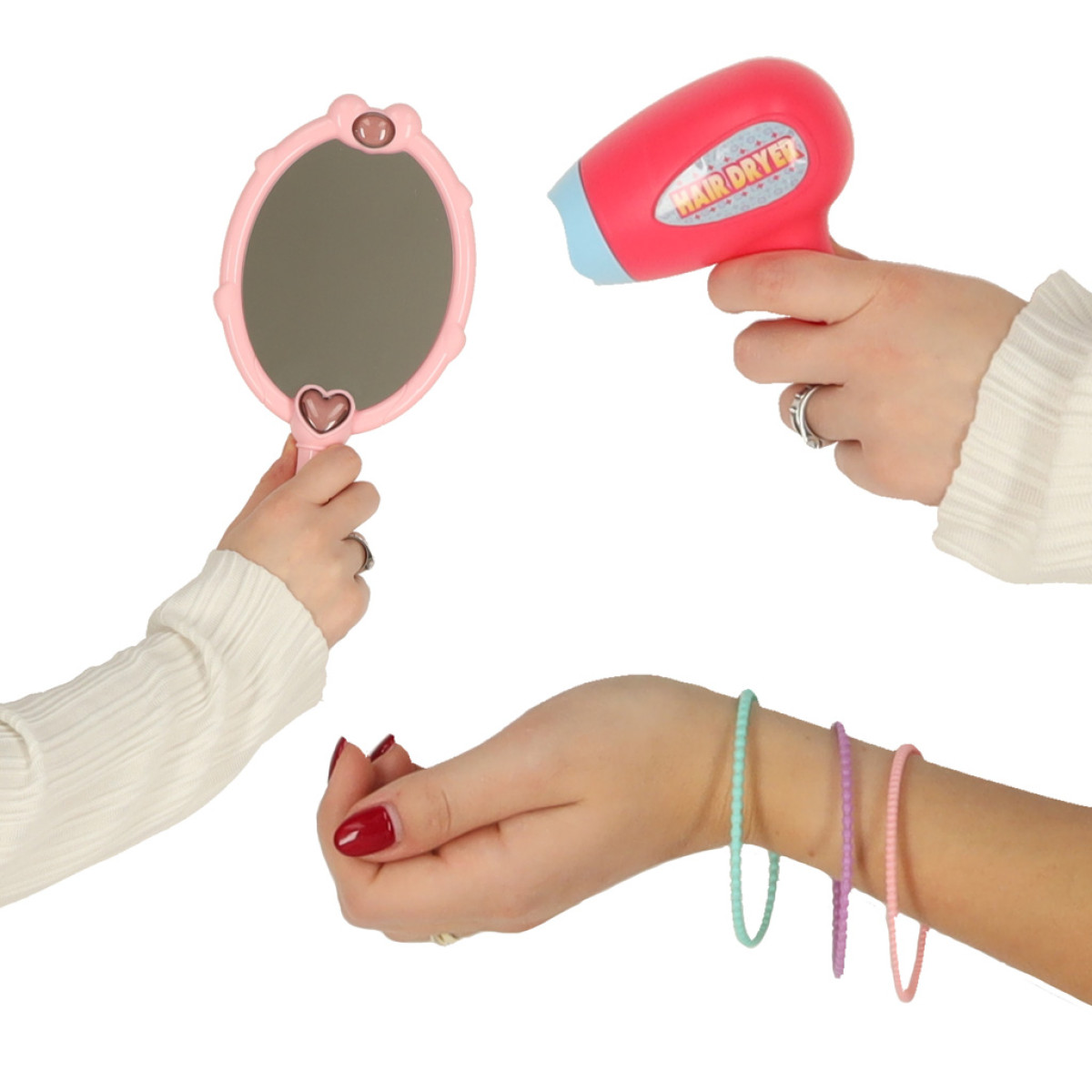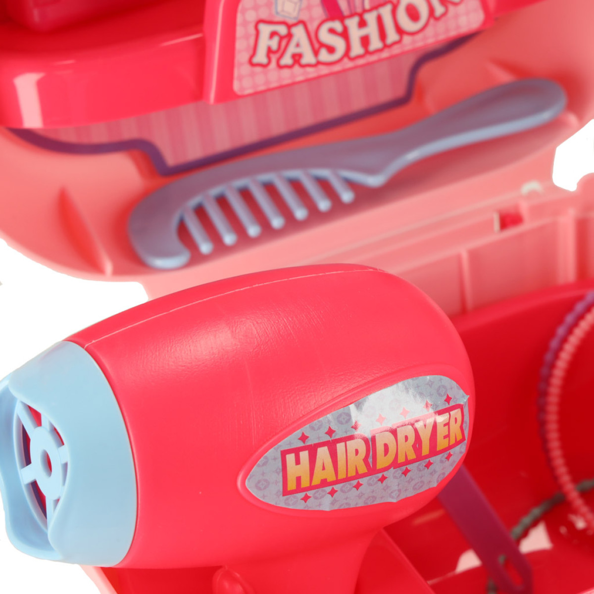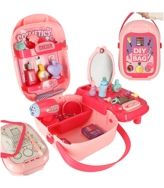Plastmasas čemodānā ir viss nepieciešamais jautrai un izglītojošai lomspēlei: rotaļu fēns, spogulītis, ķemme, matu sprādzes, gredzeni, rokassprādzes, uzlīmes un dekoratīvie pudelīšu elementu – kā nagu laka vai smaržas.