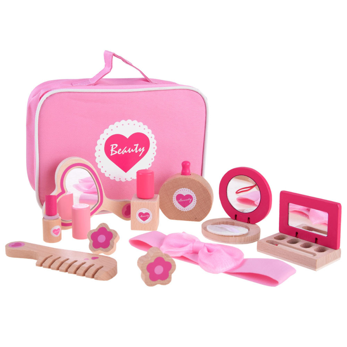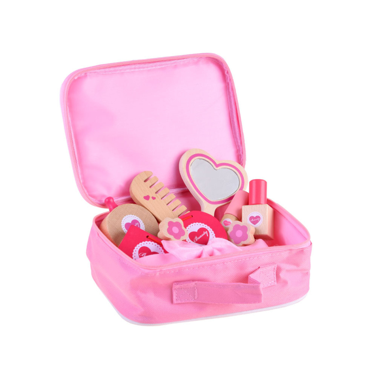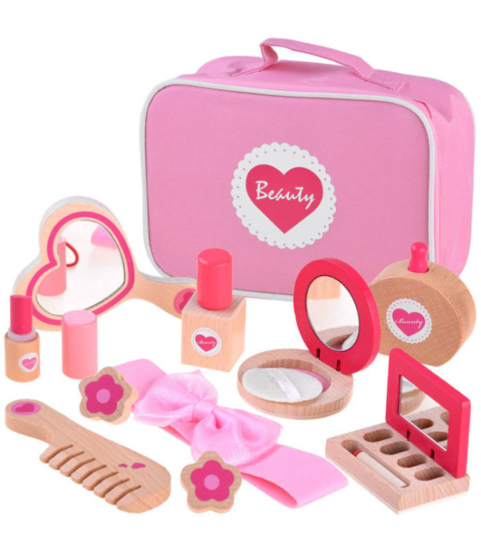 Šis stilizācijas komplekts satur visu, kas vajadzīgs mazai vizāžistei skaistumkopšanas salonā. Rotaļlieta attīsta radošumu, precīzas kustības un lomu spēļu prasmes. Komplektā ir koka elementi un aizverams kosmētikas maciņš, kas ļauj piederumus glabāt kārtīgi un droši. Produkts izstrādāts, domājot par bērna mazajām rociņām. Izturīgā un precīzā izgatavošana bez asām malām padara rotaļlietu drošu ikdienas lietošanai. Šī rotaļlieta iepriecinās katru mazo princesi un palīdzēs izveidot savu skaistuma stūrīti.