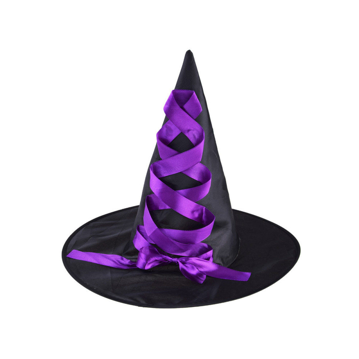 Melna cepure kā dekors ir ar purpursarkanu, satīna lentu, kas rotā raganas smailo cepuri.