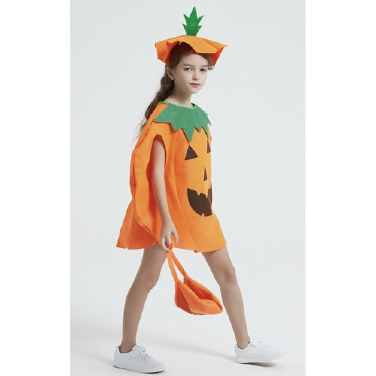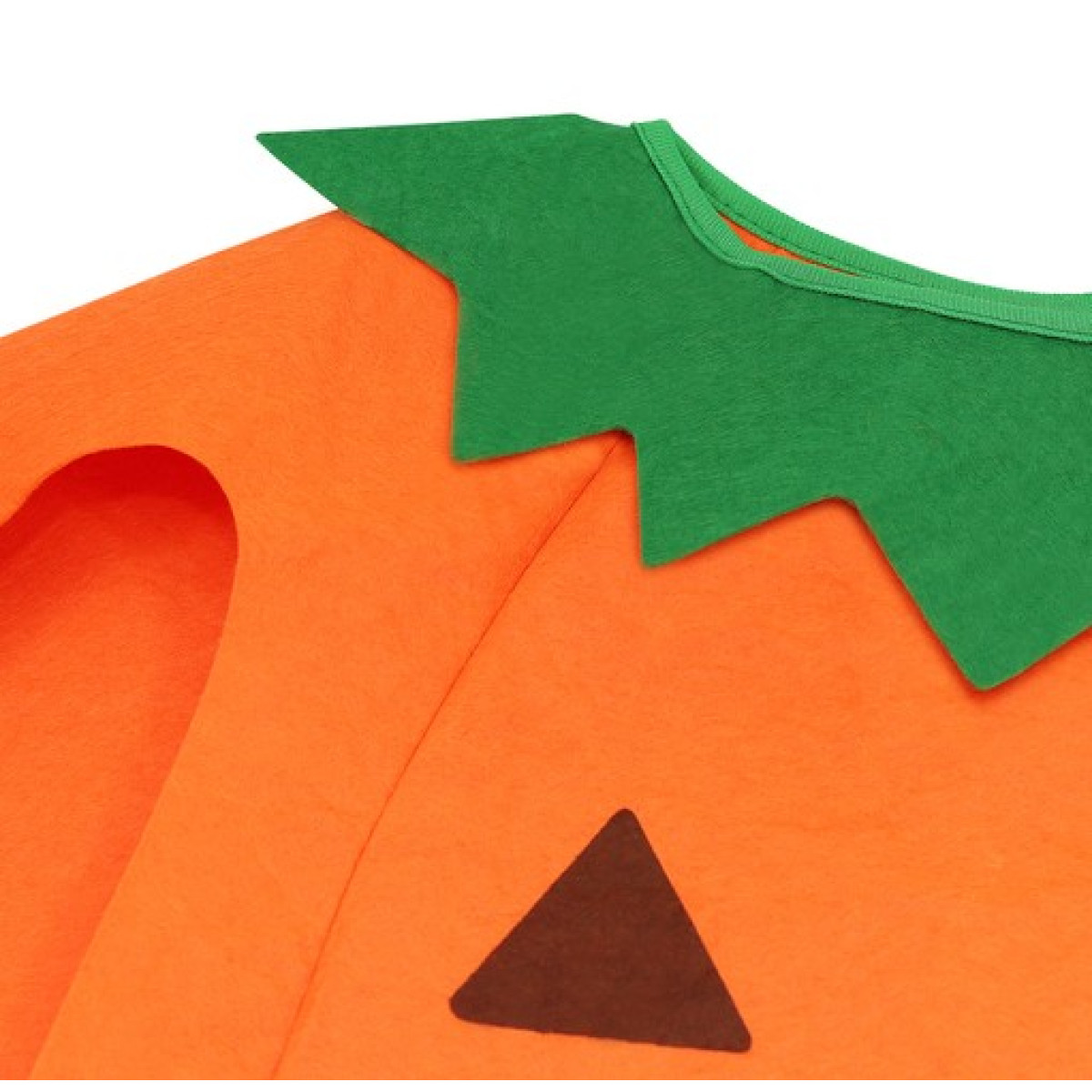 - Pievilcīgs izskats – tērps ir vizuāli pievilcīgs un izceļas ar interesantu dizainu un estētisku apdari. Spilgta oranža krāsa piešķir šarmu, un jautrie elementi noteikti izraisīs smaidu uz bērna sejas. Cepurei ir interesanta forma un to rotā zaļa, stāvoša kātiņa.
