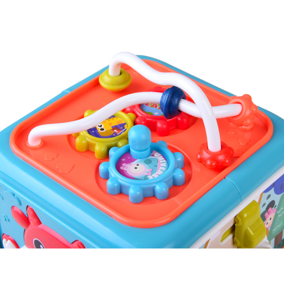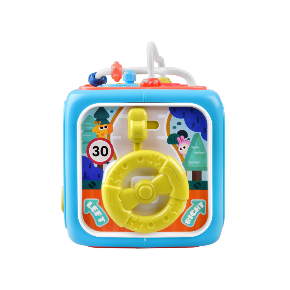 - Panelis ar labirintu: bērns var trenēt pirkstu veiklību, pārvietojot pērlītes pa šķēršļu ceļiem un griežot riteni.