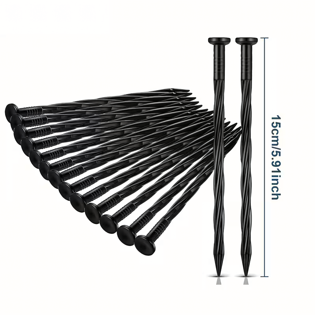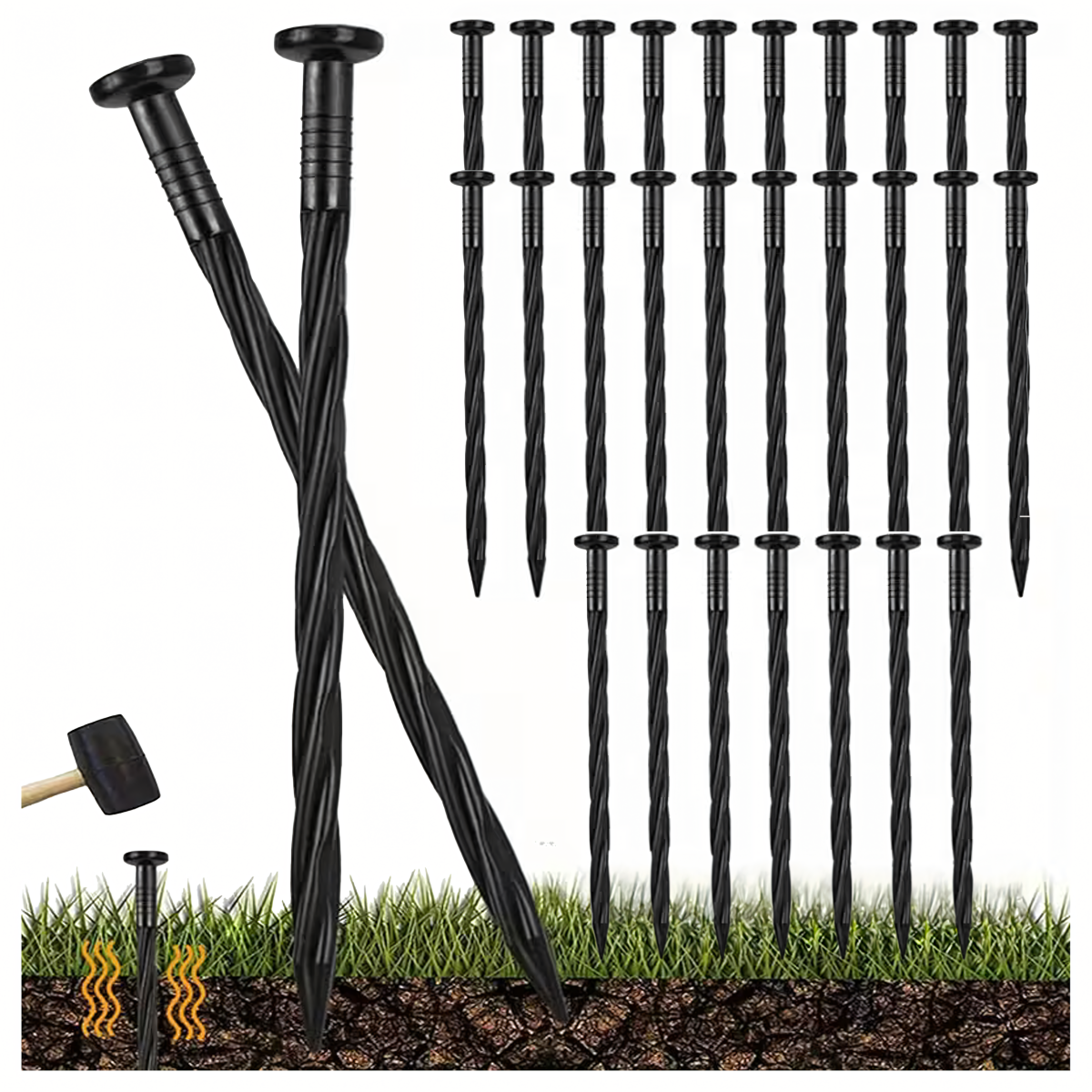 Izturīgi dārza enkuri 15 cm garumā, izgatavoti no izturīga plastmasas materiāla. Ideāli piemēroti zālāju apmaļu, agrotekstiliju, agroplēvju vai zāliena režģu nostiprināšanai. Enkuri nodrošina, ka tie neizslīd no zemes, un galviņa aizsargā materiālu no bojājumiem.