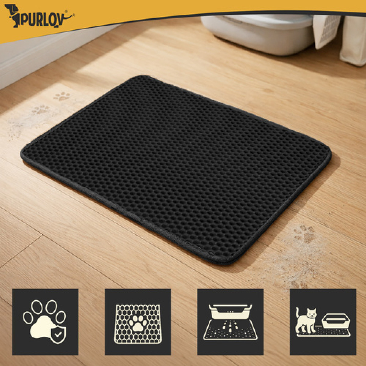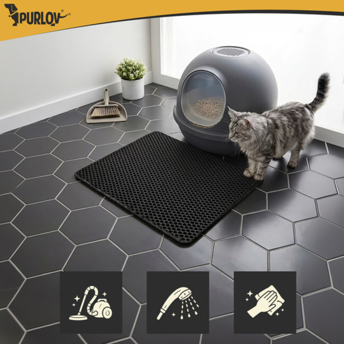 Purlov kaķu pakaišu paklājiņš 60 x 45 cm melnā krāsā ir praktisks risinājums, kas palīdz uzturēt tīrību ap kaķu tualeti. Divslāņu šūnveida virsma efektīvi savāc pakaišu graudus no ķepām un samazina to iznešanu pa māju.