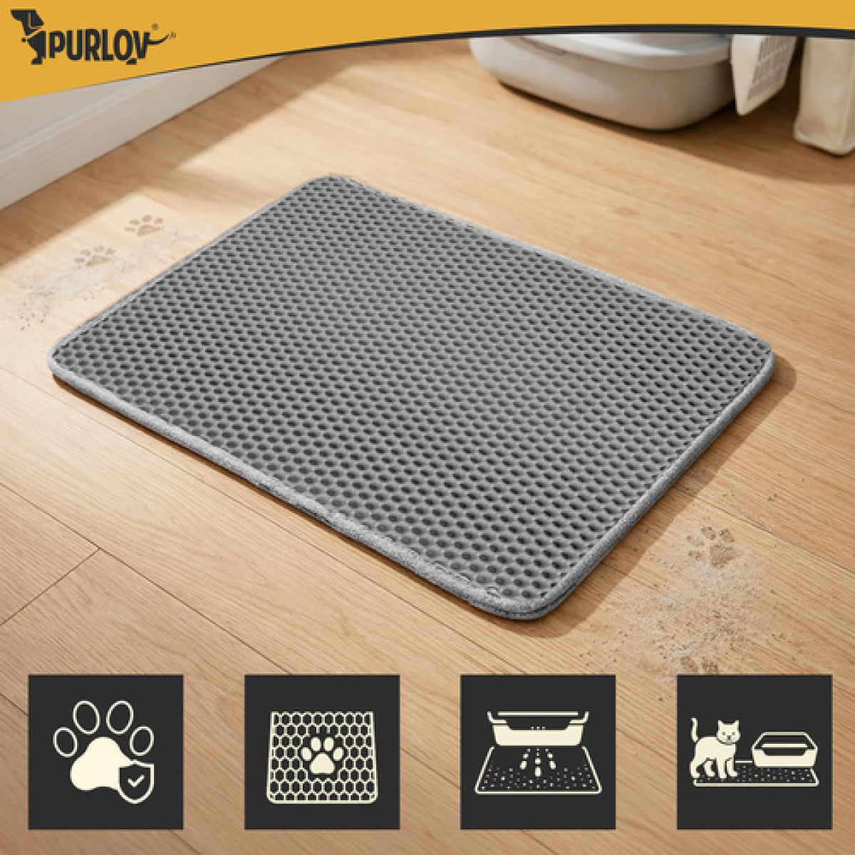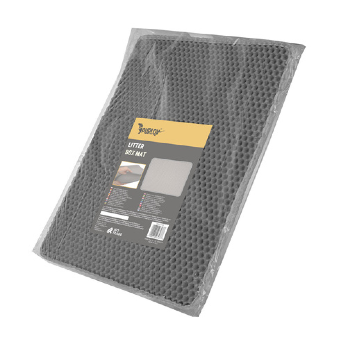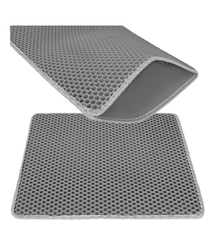 Purlov kaķu tualetes paklājiņš 60 x 45 cm pelēkā krāsā palīdz uzturēt grīdu tīru ap kaķu tualeti. Divslāņu šūnveida eva putu struktūra efektīvi savāc pakaišu granulas no ķepām un samazina to iznešanu pa mājokli.