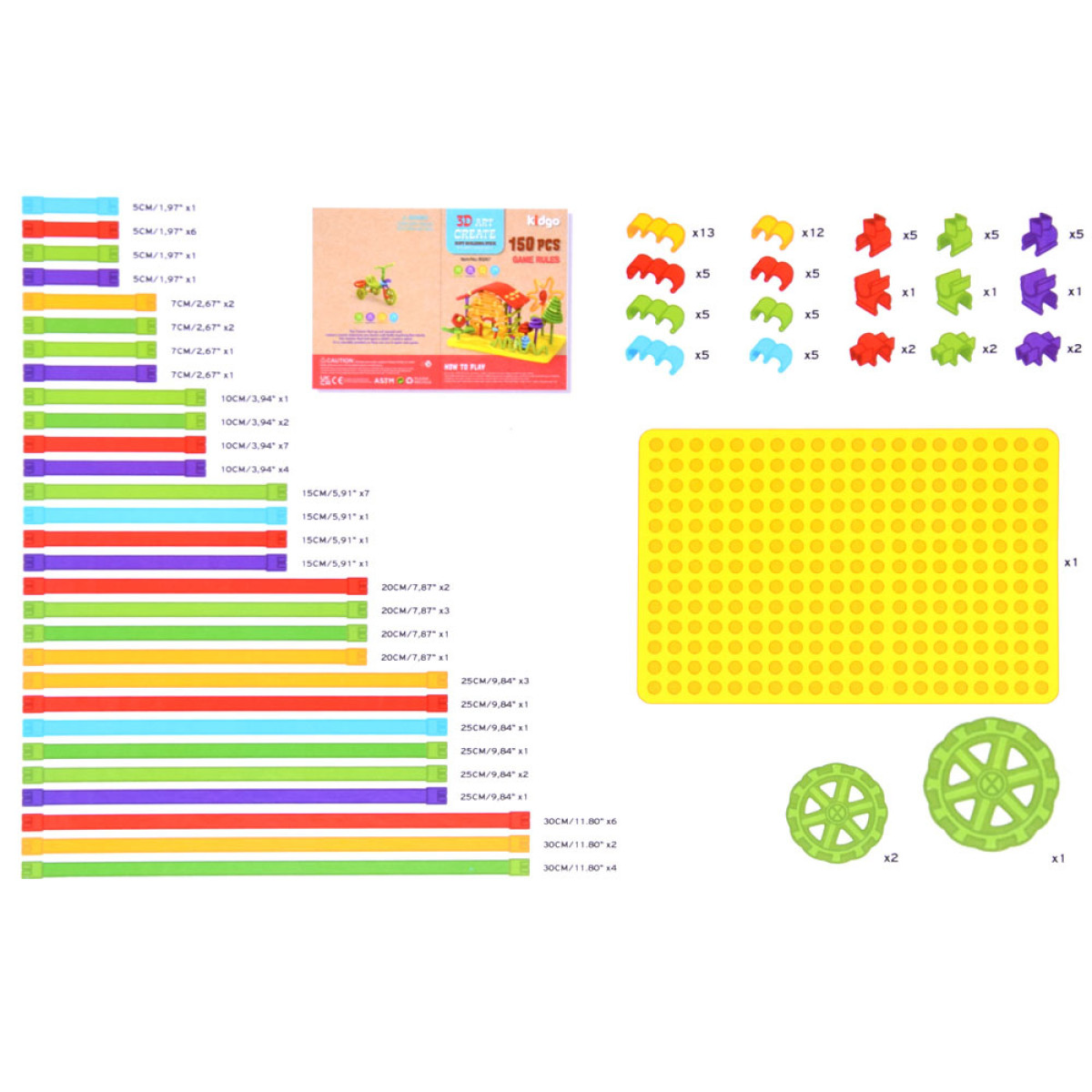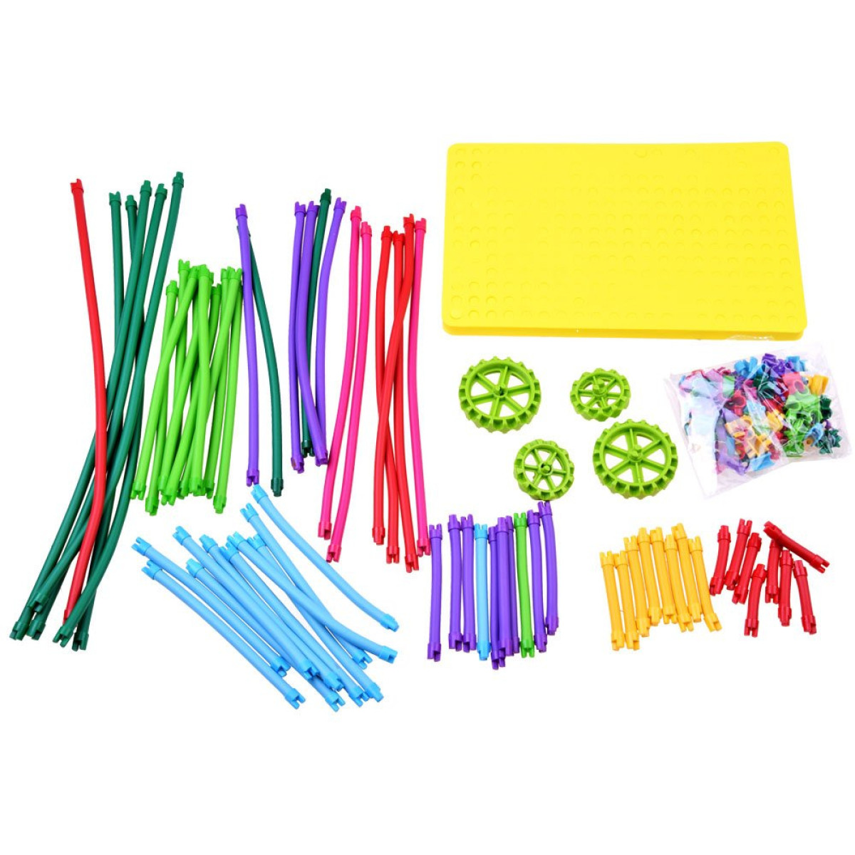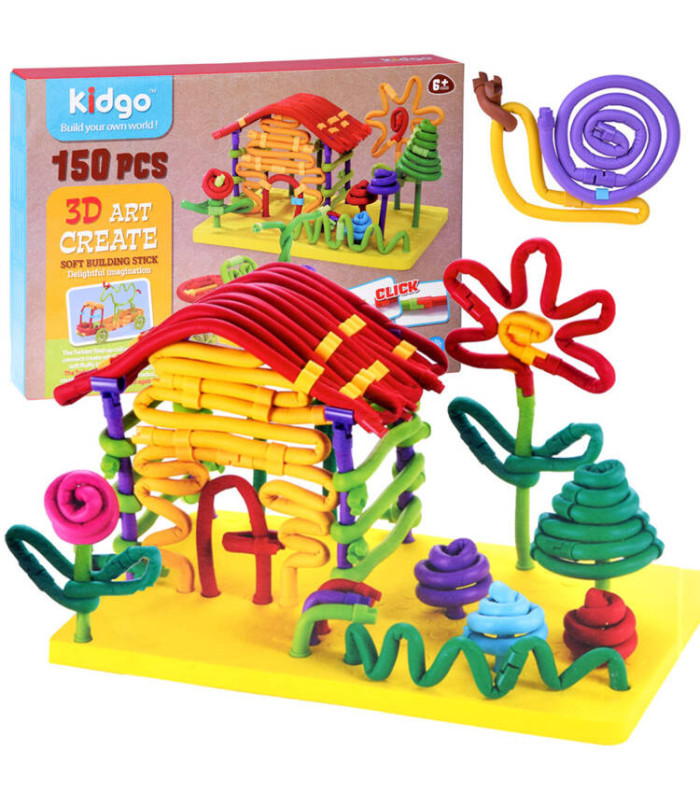Radošs elastīgo kluču komplekts, kas pazīstams arī kā makaroni, būs iecienīts ikvienam bērnam. Komplektā ir 150 elementi, kas nodrošina daudz ideju dažādu figūru, ēku, dzīvnieku un citu objektu veidošanai.