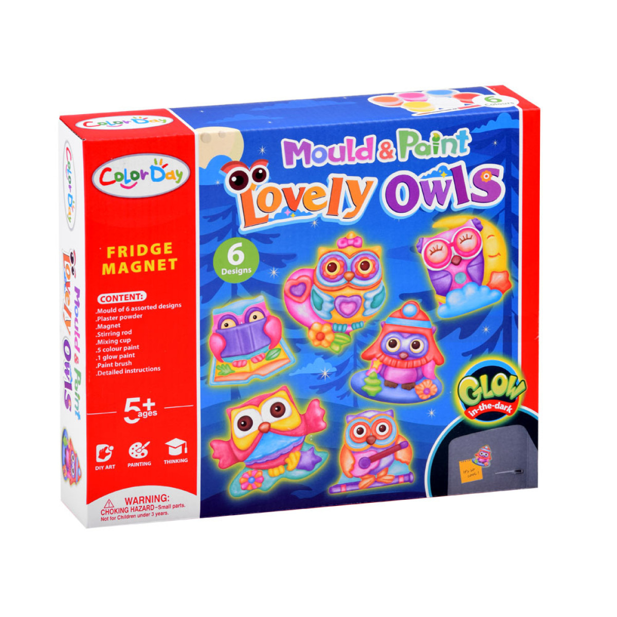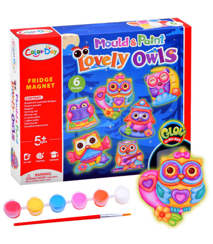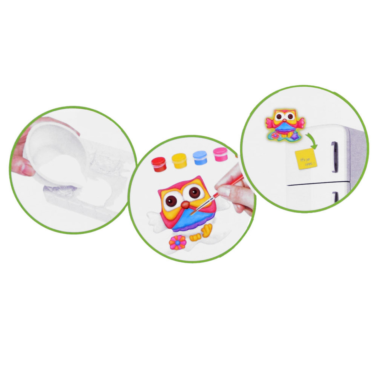 Radošs pūču magnētu komplekts bērniem spēlēm ir ideāla dāvana katram mazulim, kuram ir mākslinieka dvēsele. Spēlēšanās ar ģipsi ir lieliska pieredze bērnam. Bērniem patīk veidot dažādas formas no plastiskās masas un pēc tam tās krāsot pēc savas iztēles. Šis komplekts ir paredzēts radošām spēlēm, veidojot magnētus ledusskapim pūcīšu formā. Bērnam jāveic atsevišķi sagatavošanas darbi, jāizveido ģipša atlējums un pēc tam jānokrāso pēc saviem ieskatiem un jāpiestiprina magnētiskā lente.