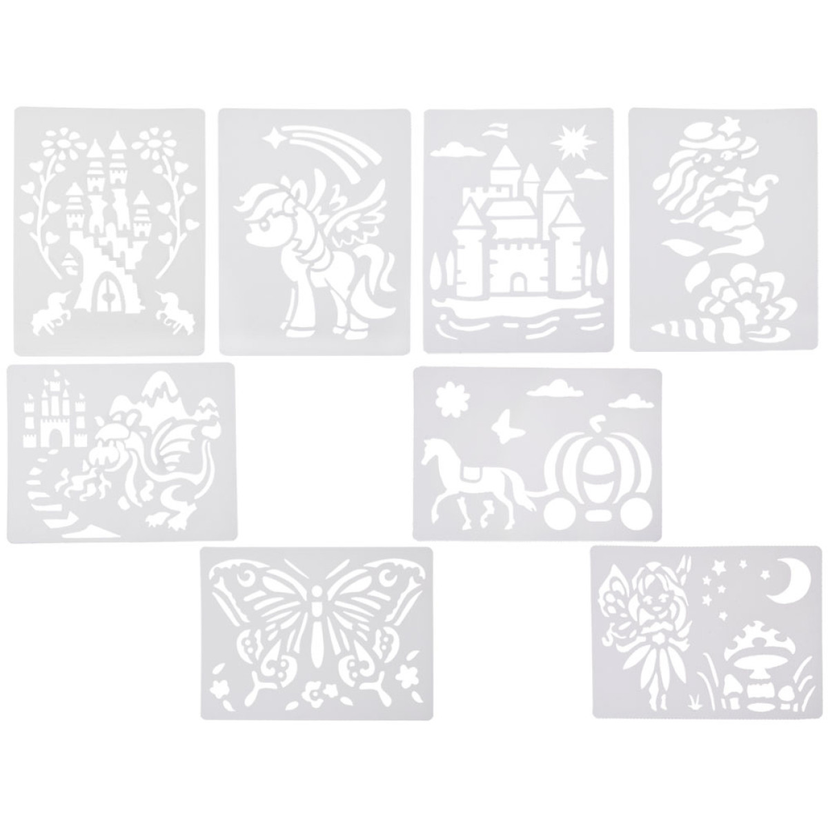 - 8 trafareti (taurenis, 2 dažādi pilis, pūķis ar uguni un pili fonā, nāriņa, zirgs ar karieti, meža feja, ponijs)