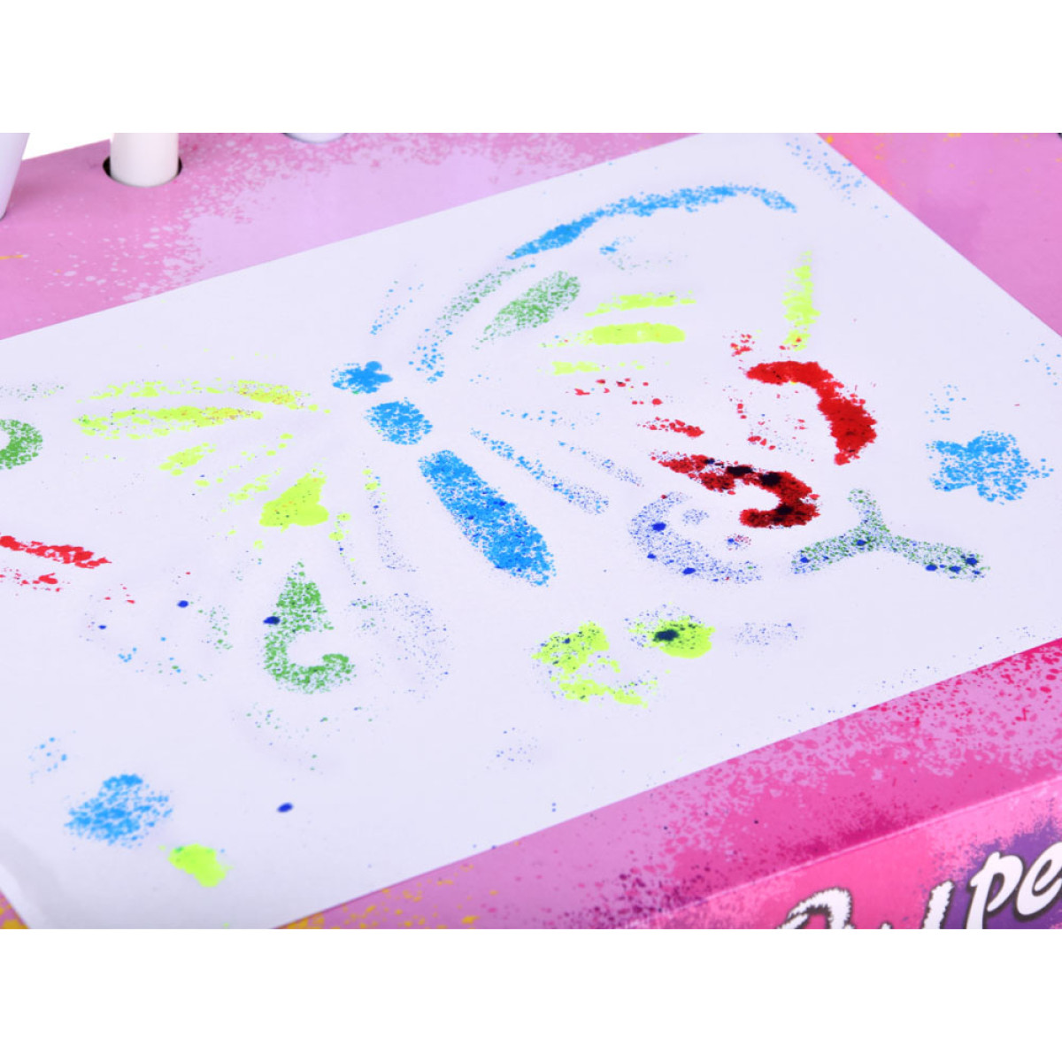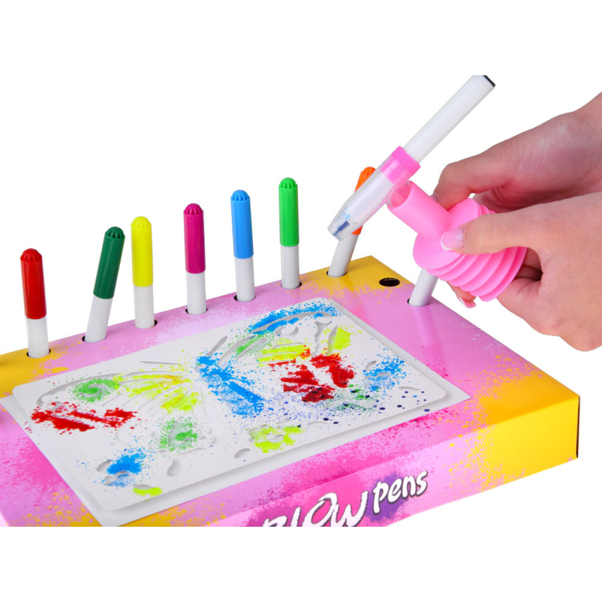 Izklājiet spēles vietu, kur varat netīrīt apkārtni - vislabāk izmantot avīzes vai foliju. Tad novietojiet papīra lapu un izvēlēto trafaretu. Ievietojiet marķieri pumpī un enerģiski pumpējiet, mērķējot uz trafaretu. No marķiera izplūdīs pilieni, kas veidos unikālas ilustrācijas. Marķieru krāsas var mainīt spēles laikā, tādējādi neviens attēls nebūs vienāds.