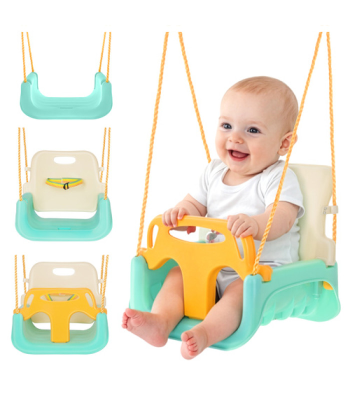 - 3 vienā konstrukcija ar noņemamu barjeru un atzveltni - viena šūpole, pielāgota dažādiem bērna attīstības posmiem, bez nepieciešamības katru sezonu pirkt jaunu