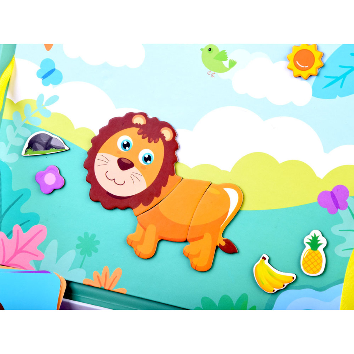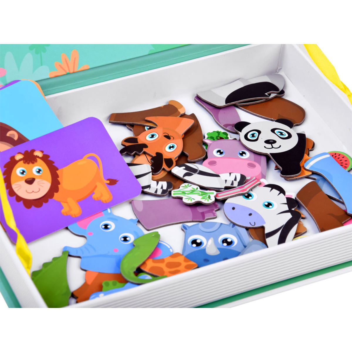 Magnētiskā puzle ZOO dzīvnieki ļauj bērnam pašam izveidot uz dēļa lācīti, zebru, lauvu un citus dzīvniekus pēc kartes parauga. Tāpat bērns var radīt savu dzīvnieka versiju, piemēram, "žirafzebra" vai zilonis ar lācīša kājām. Šis komplekts ir iepakots stingrā kartona kastē, kas atgādina grāmatu, un iekšpusē ir zaļas ainavas dēlis, uz kura bērns var izvietot savus dzīvnieku idejas.