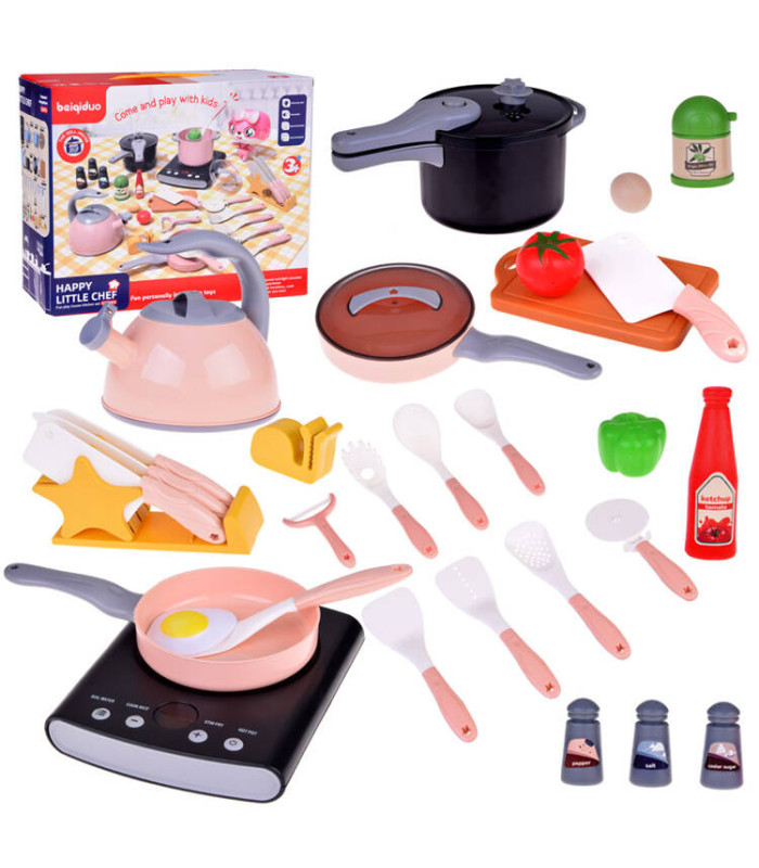 Pārnēsājamais mazuļa pavāra komplekts ar elektrisko plīti un piederumiem, traukiem ēdienu gatavošanai nodrošinās daudz prieka katram mazajam bērnam, kurš vēlas spēlēties ar ēdienu gatavošanu savām lellēm un lācīšiem.