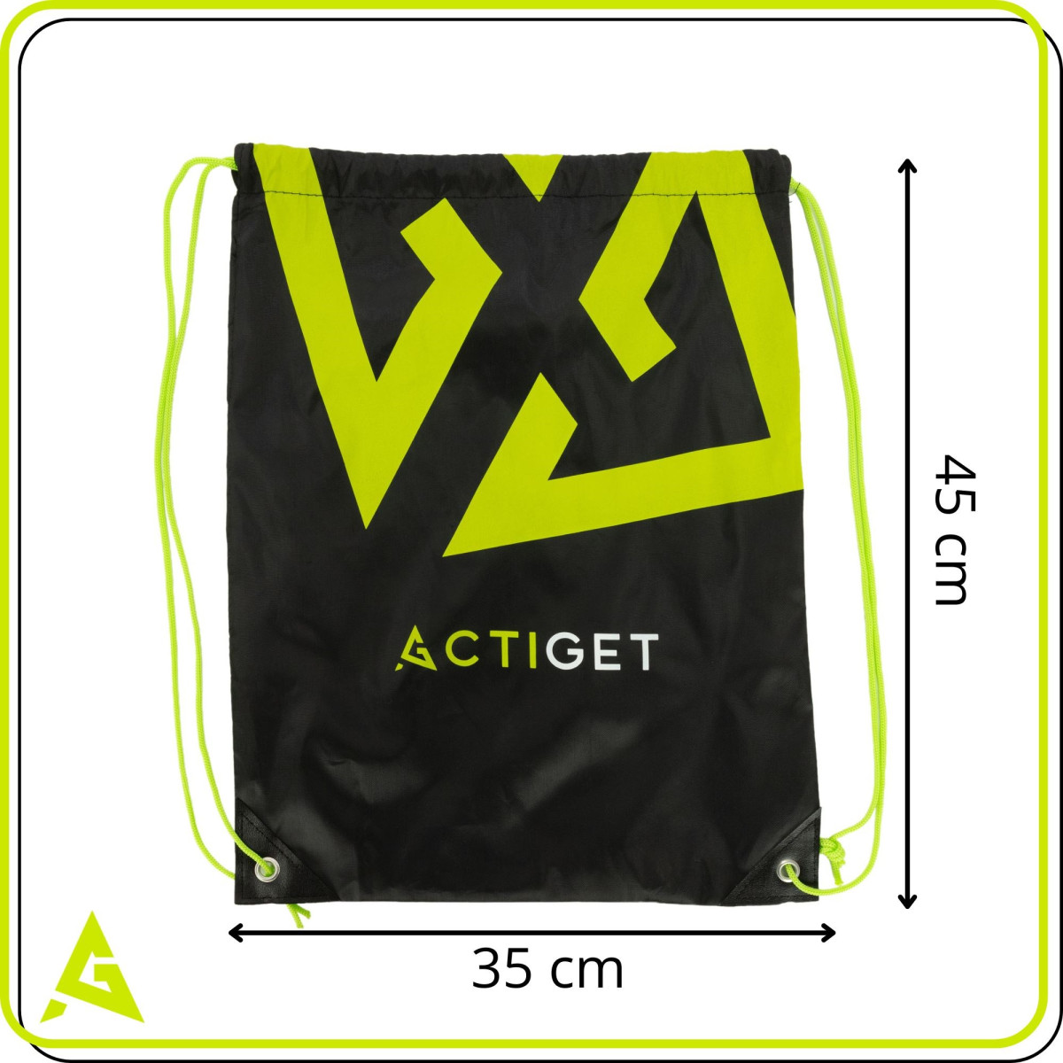 Actiget® apavu soma ir praktisks un funkcionāls aksesuārs aktīvam dzīvesveidam. Izgatavota no izturīga 210D Oxford poliestera, kas ir piemērots ikdienas lietošanai. Materiāls ir nodilumizturīgs un viegli tīrāms. Soma ar 20 litru ietilpību nodrošina ērtu sporta apavu un treniņtērpa uzglabāšanu. Savelkamā aukliņas aizvēršanas sistēma ļauj ātri un vienkārši nostiprināt saturu. Metāla cilpiņas stūros nostiprina struktūru un palielina izturību. Nelielais svars padara somu ērtu nēsāšanai, pat bērniem.