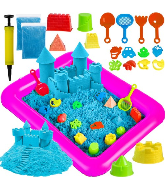 ✓ Liels komplekts – komplektā ietilpst: 2 kg smiltis, 14 plastmasas formas, grābeklis, siets, lāpstiņa un piltuve. Ar šādiem piederumiem nebūs iespējams garlaikoties. Komplektā ir arī pūšamā smilšu kaste, kas ļauj uzturēt kārtību spēles vietā.