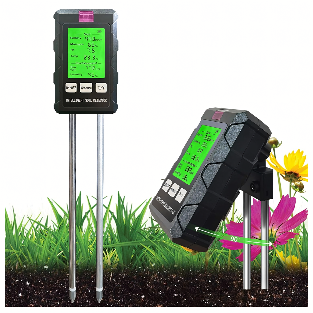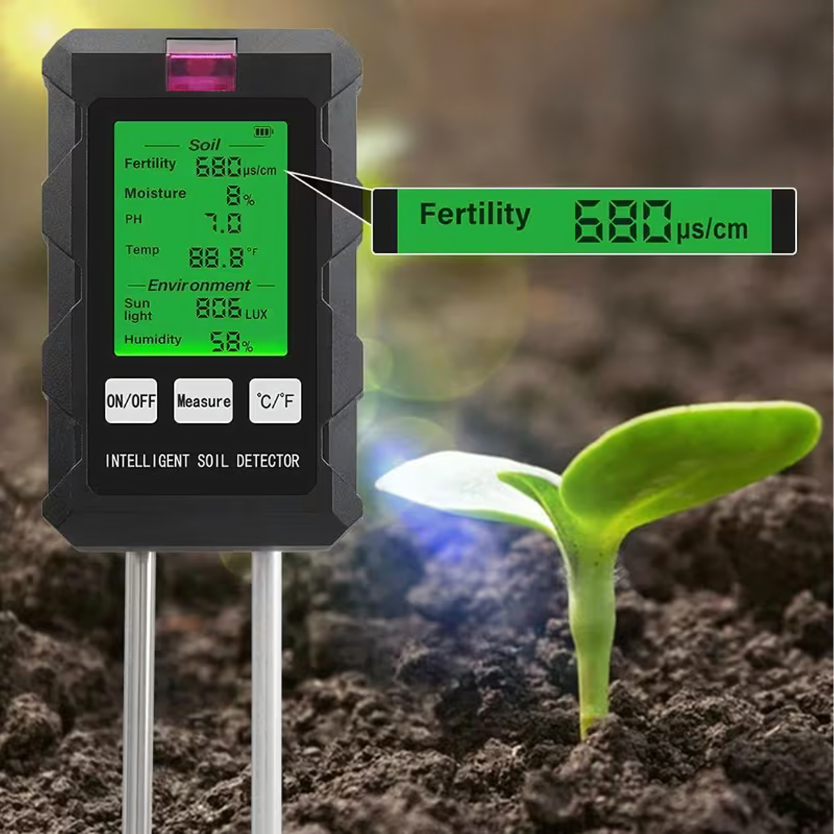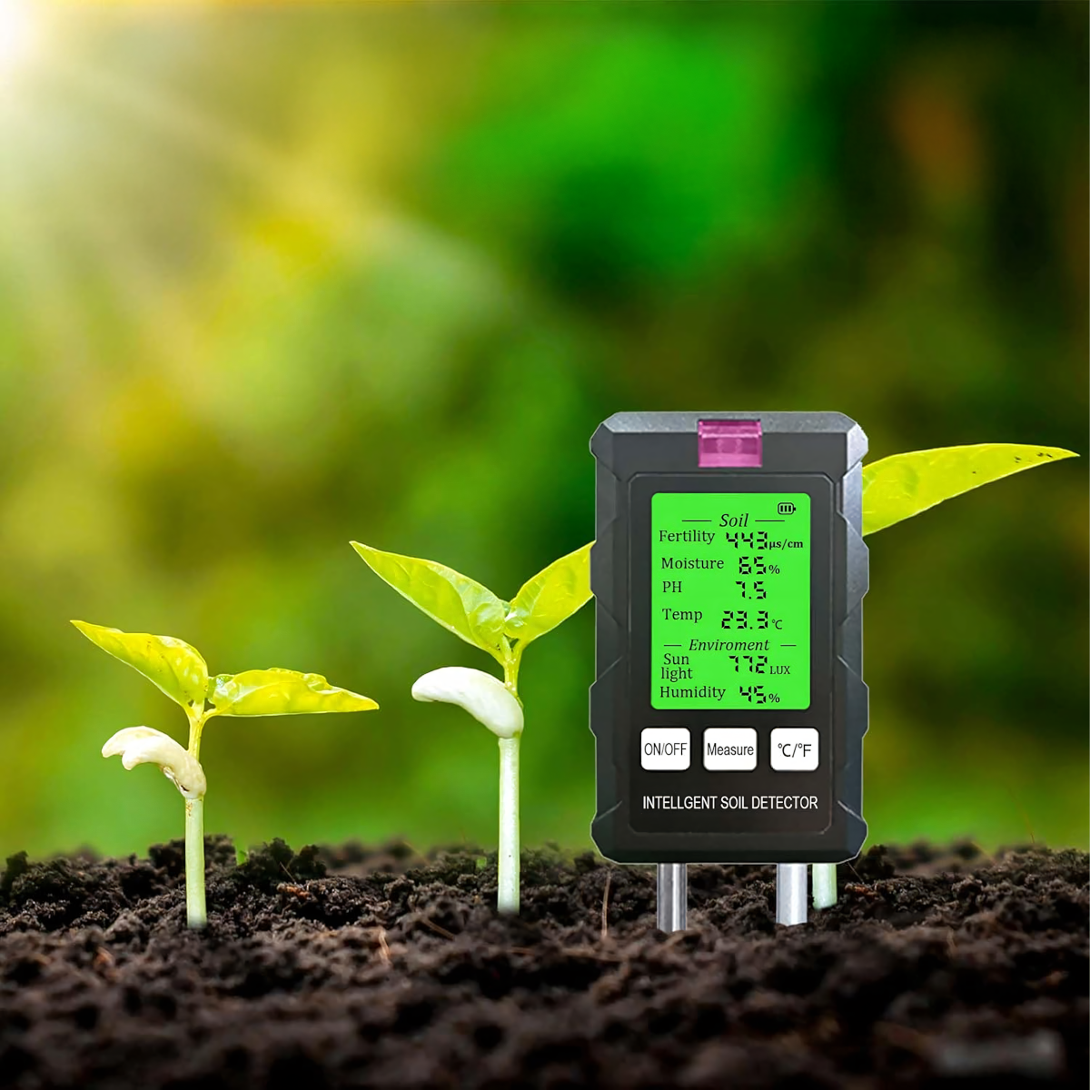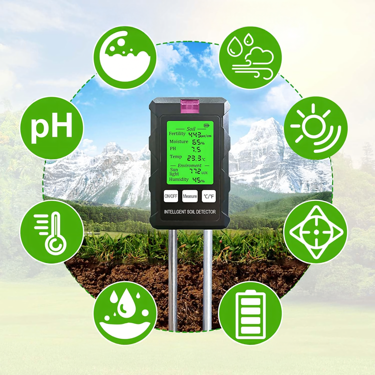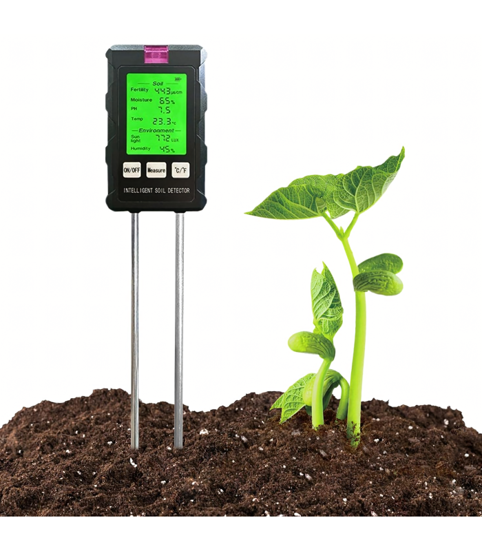 Mērījumu diapazons: pH, augsnes mitrums, augsnes temperatūra, auglība, gaisma, apkārtējās vides mitrums